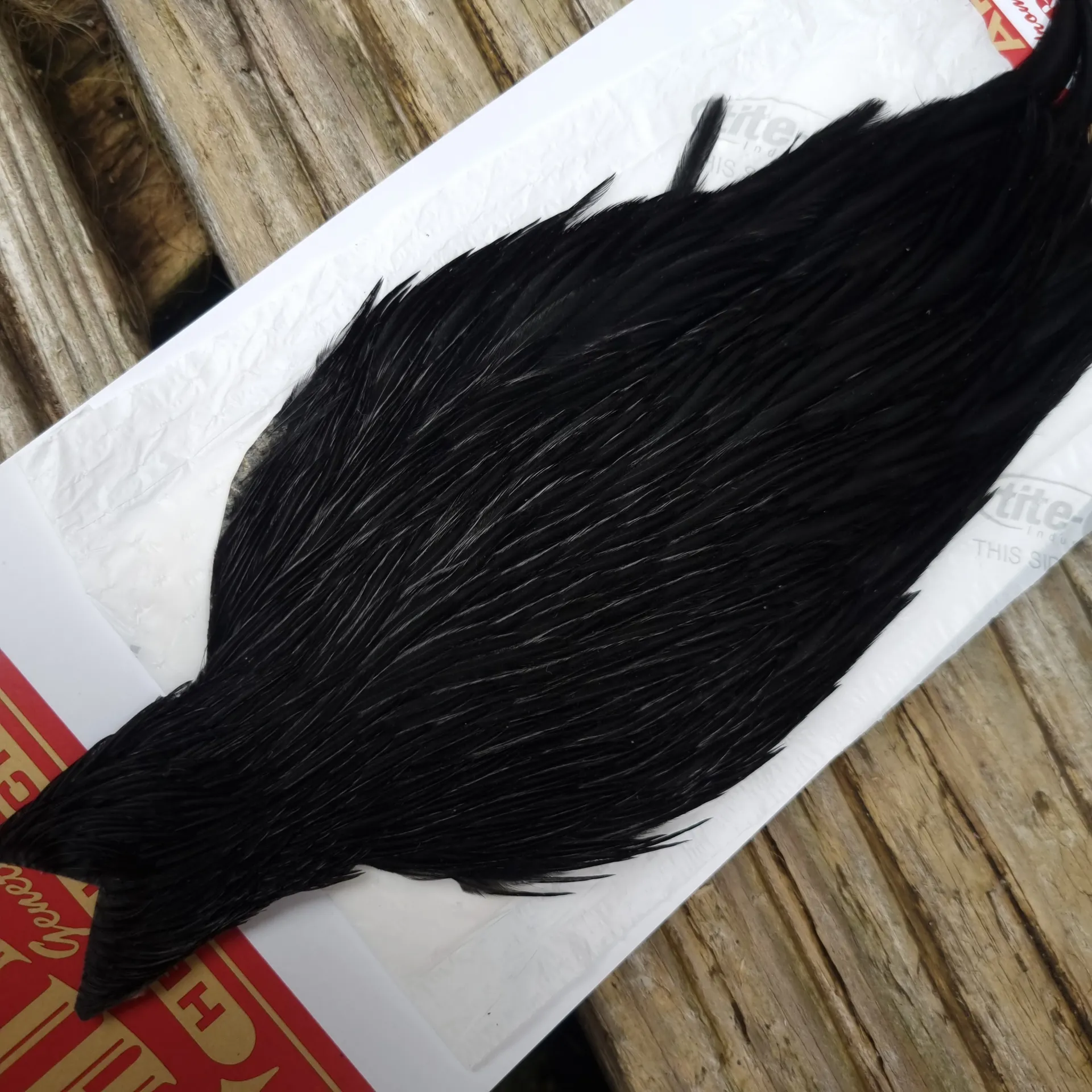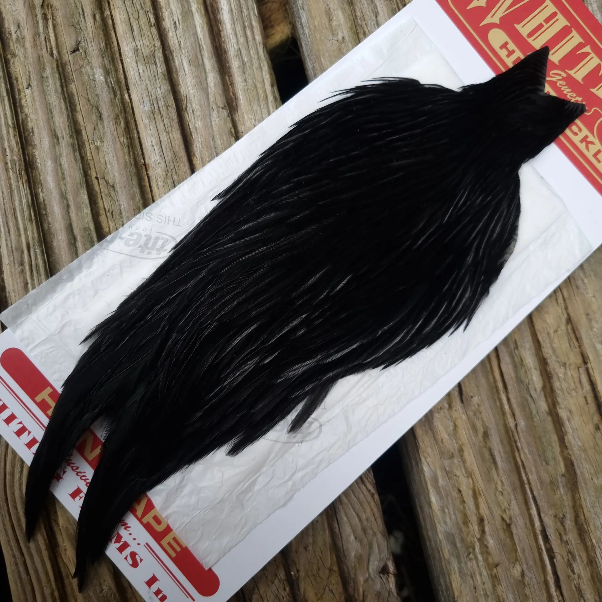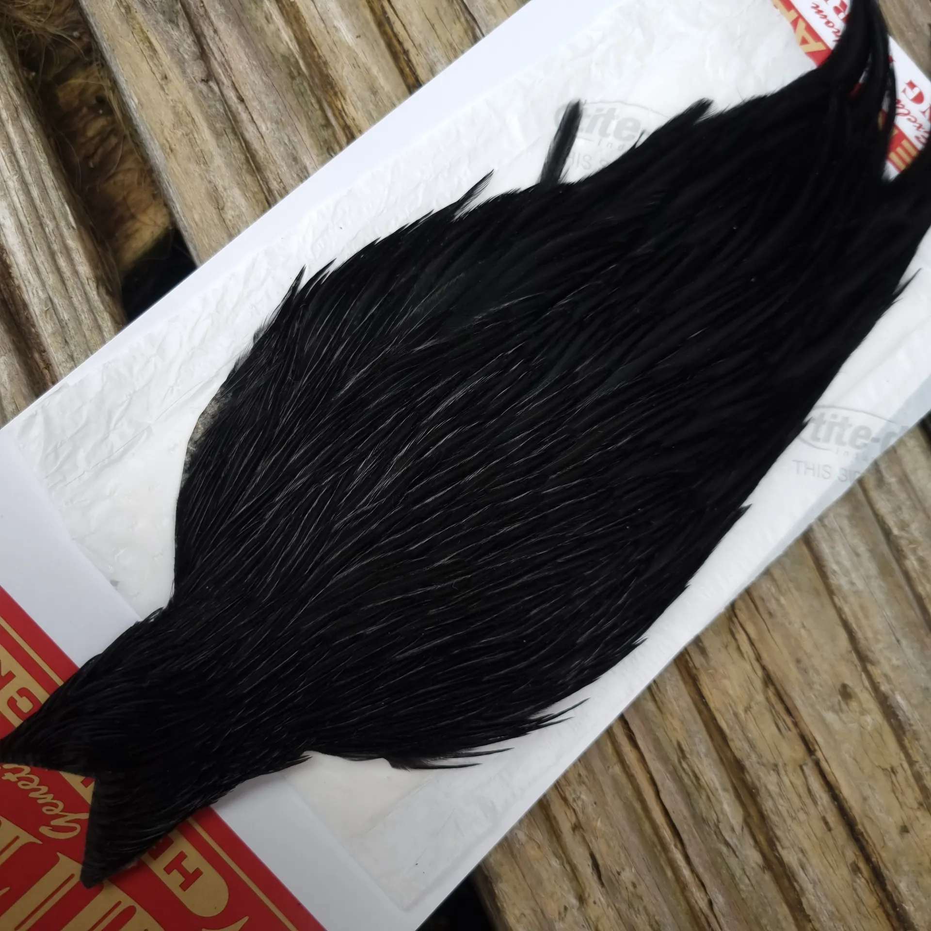 Whiting Hen Capes in DYED BLACK are a must for any fly tier tying wet flies and these Whiting Hen Capes are perfect for palmering. Whiting Dying is very consistent with very little variation and with black they are all basically the same but cape size will change a little so YES THIS IS A BUY WHAT YOU SEE PRODUCT RANGE!!!!