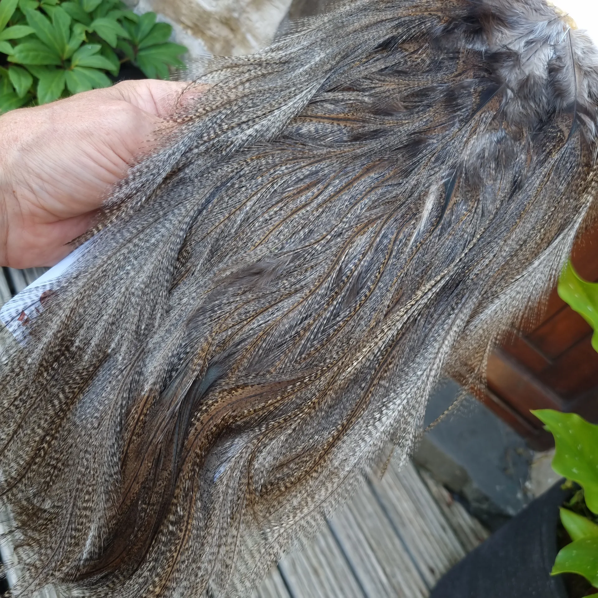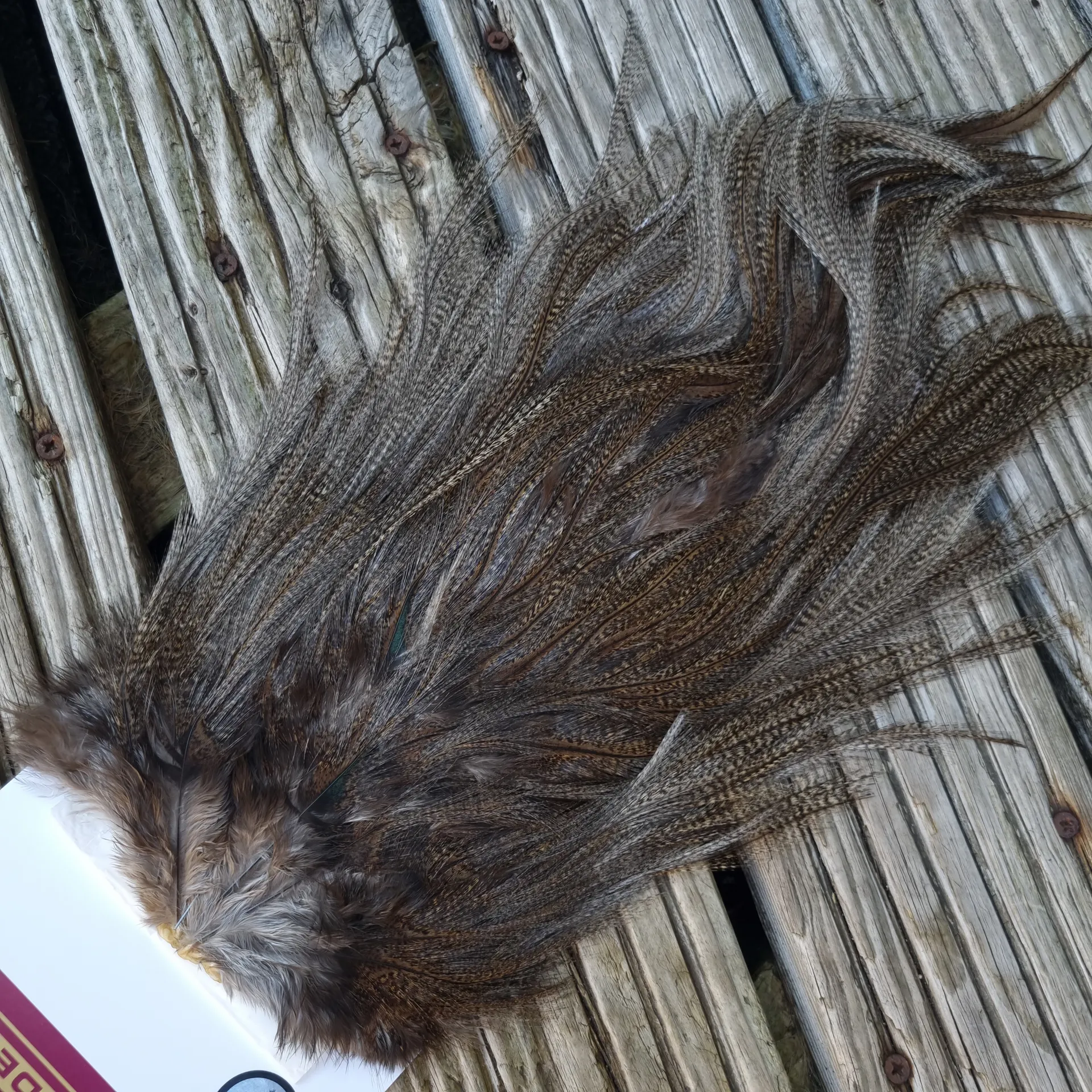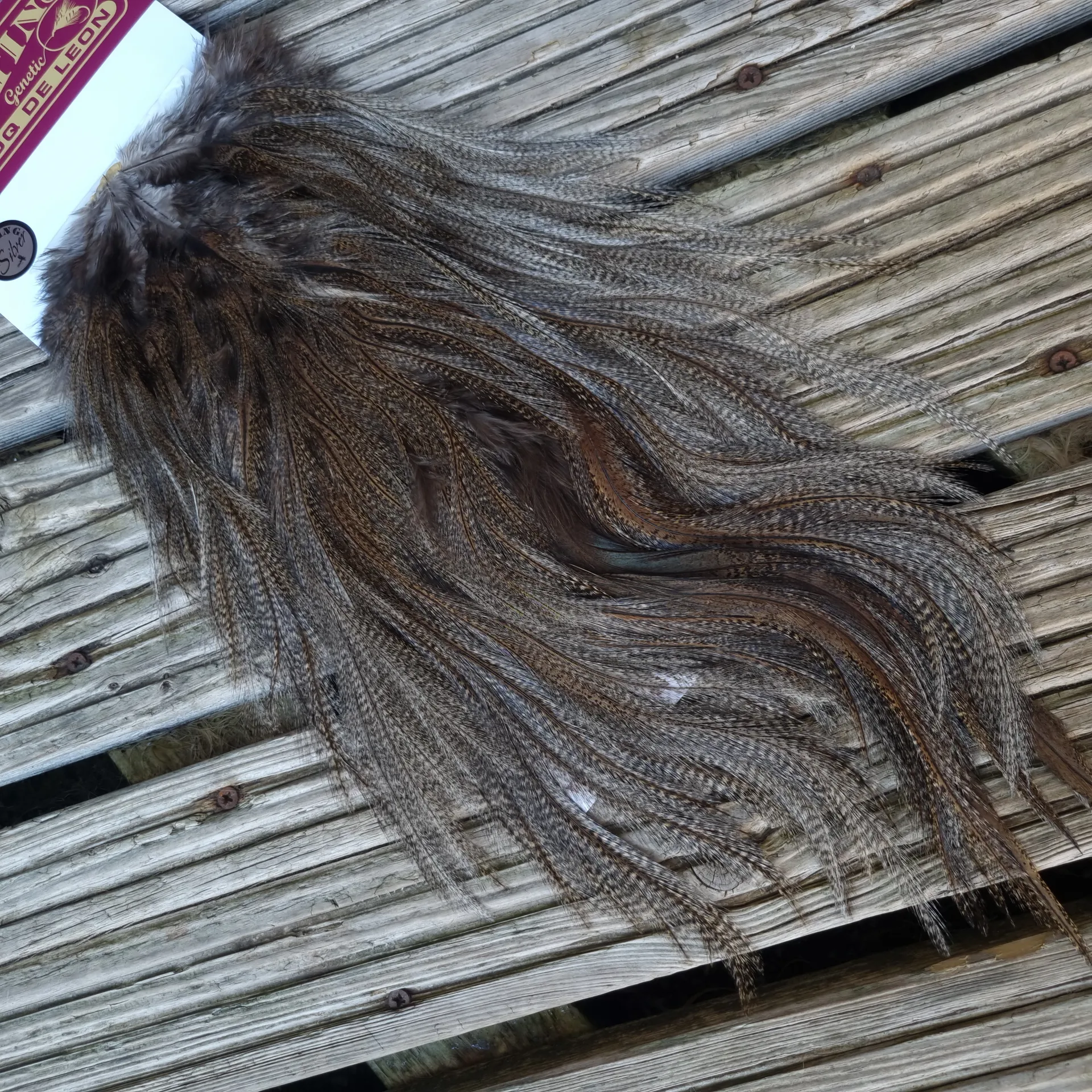 Whiting Silver Grade Coq de Leon Rooster Saddle in Dark Pardo B, as you can see this is a BUY WHAT YOU SEE PRODUCT RANGE, yes you’re buying the Image so take a good look at all the images provided to make sure you select the correct Saddle for your needs!!WOW what a saddle so DARK PARDO is a lot darker than the Medium Pardo’s but it has caused issues because there is so MUCH SHINE on the hackles the light kept reflecting back and changing the colour SO LOOK AT ALL THE IMAGES it’s the same saddle!!! Big, Densely Hackled and a stunner just perfect for a weekends tying!!! Love the images buy the SADDLE!!!
