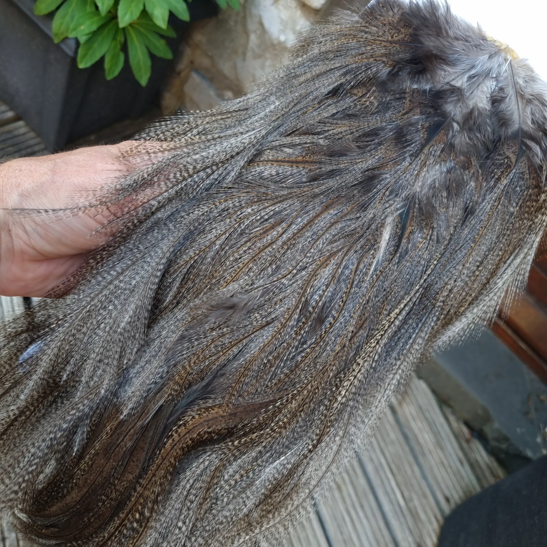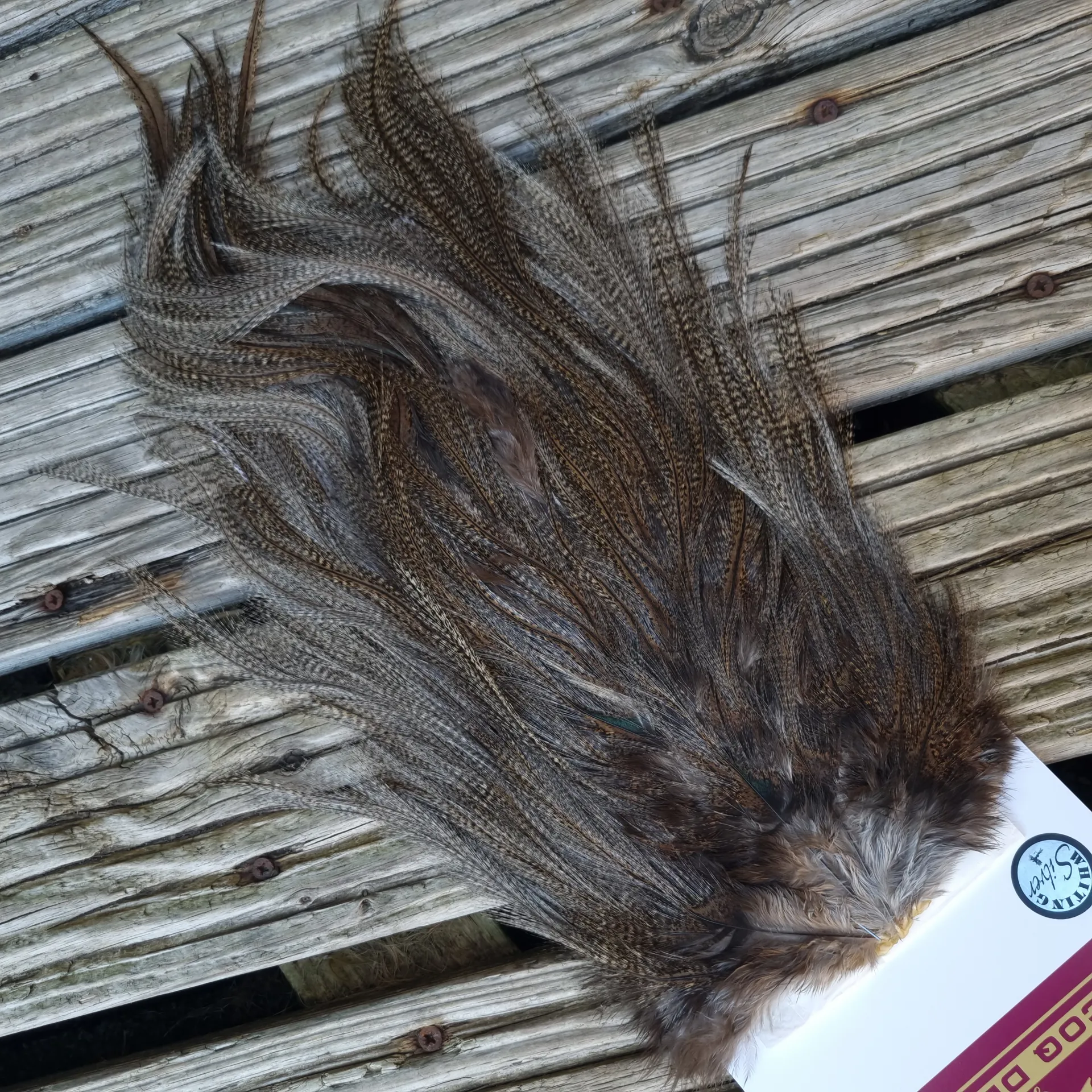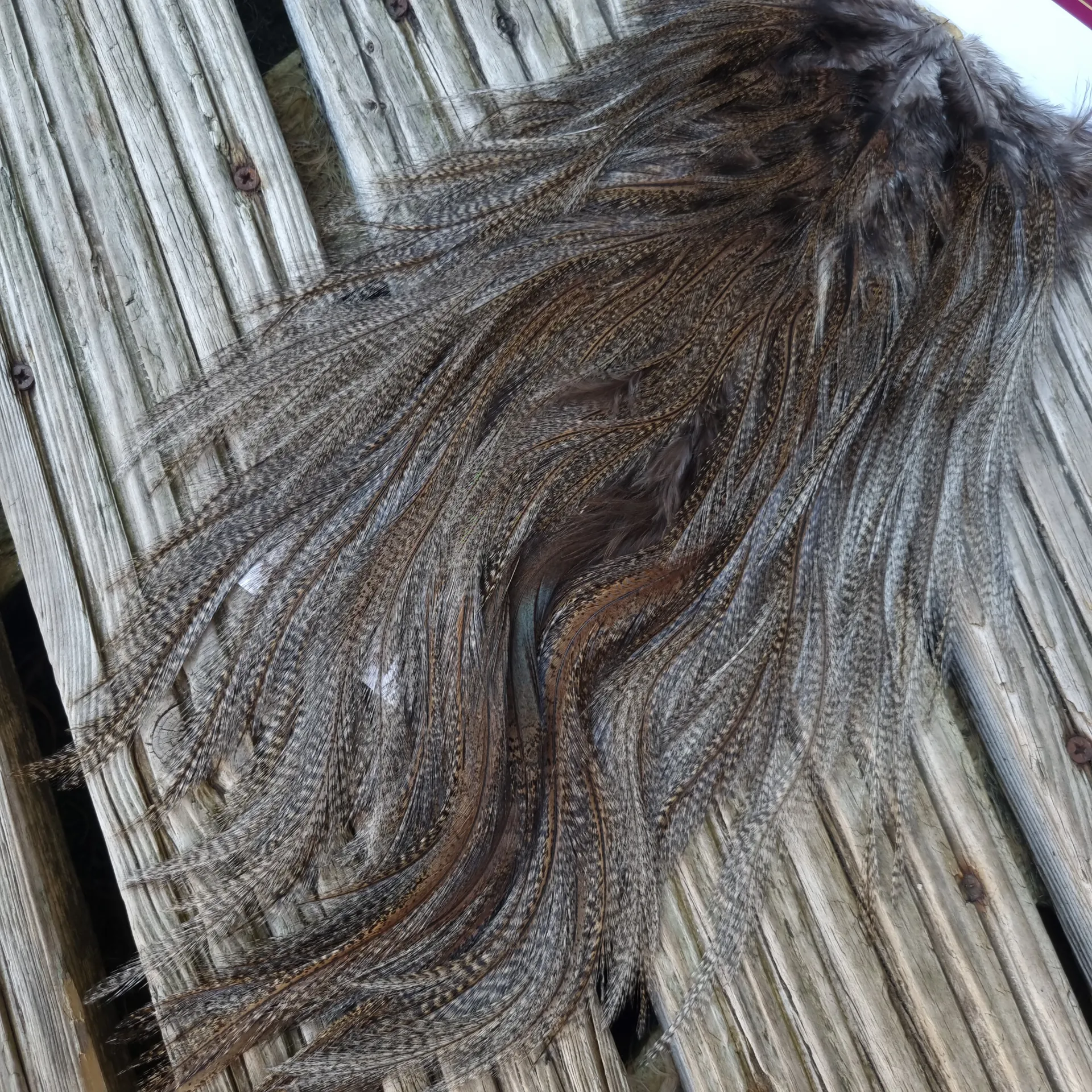 Whiting Silver Grade Coq de Leon Rooster Saddle in Dark Pardo B, as you can see this is a BUY WHAT YOU SEE PRODUCT RANGE, yes you’re buying the Image so take a good look at all the images provided to make sure you select the correct Saddle for your needs!!WOW what a saddle so DARK PARDO is a lot darker than the Medium Pardo’s but it has caused issues because there is so MUCH SHINE on the hackles the light kept reflecting back and changing the colour SO LOOK AT ALL THE IMAGES it’s the same saddle!!! Big, Densely Hackled and a stunner just perfect for a weekends tying!!! Love the images buy the SADDLE!!!