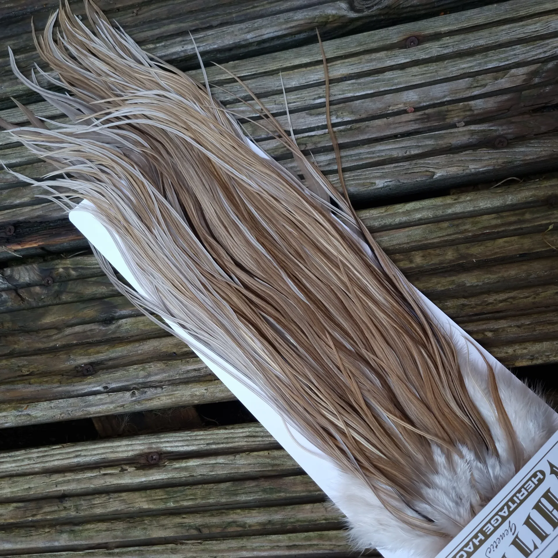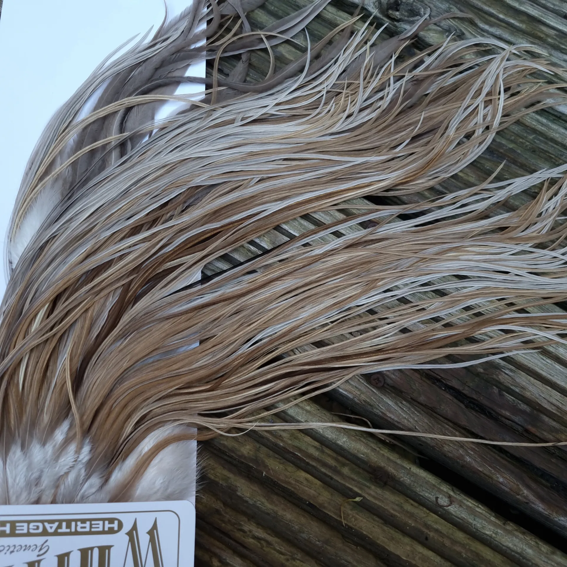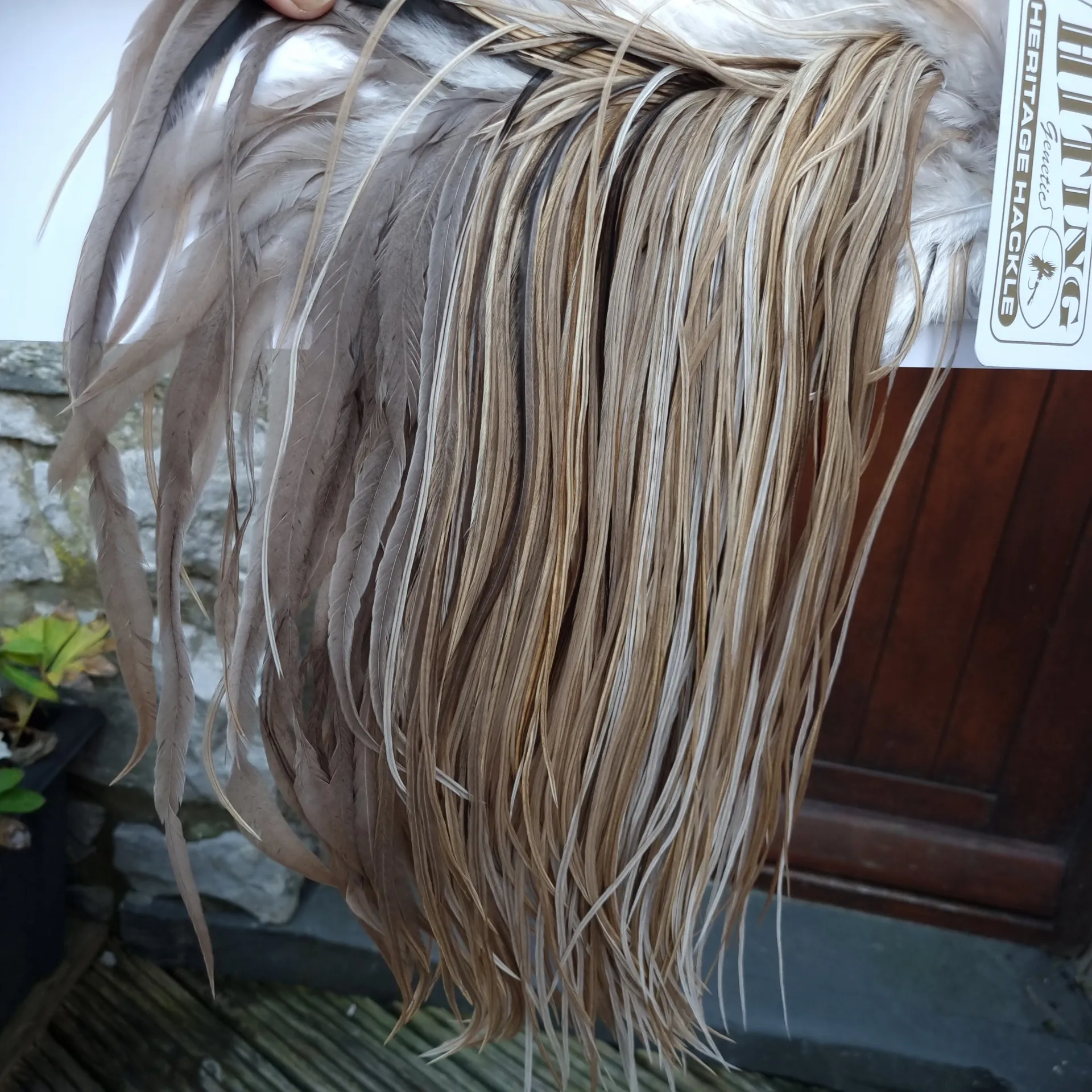 The Whiting Heritage Hackle Saddles are the colours of yesteryear from the days of Ted Hebert and Andy Miner and then the quality has been improved by Dr.Tom Whiting with his selective breeding program. The Heritage hackle is all about the most sought after hard to get colours like Speckled Badger, Speckled Duns and the Champagne range of colours and those very special Unique Variants that you only see once in a while!! Owning a Heritage Hackle Saddle is something to treasure as the colouration on most is unique with each saddle being very special in its own right.Whiting Heritage Hackles Rooster Saddle in Mixed Colours A Dun Badger/Natural Dun/Tan Dun/Sandy Dun/Dark Tan Dun Approx Tying Sizes 12/14 with the odd one either side!! OK so it comes labelled as a Badger Variant but any fly tier worth their Salt can see it rammed with Natural Dun Hackles in a big range of colours including Dun Badger BUT saddle A is offering much more than one colour because it has so many different Dun Shades Splashed across the entire saddle!!!IF YOU LOOKING FOR A COLOUR RANGE OF NATURAL DUNS THIS COULD BE THE SADDLE FOR YOU, but only if it’s giving the tying sizes you require!!! As you can seeit’sdensely hackled with hackles that average 12-19” (31-49cm) in length. Rememberyou'rebuying the saddle in the image so take your time read the sizing and scroll through all the images provided!!!
