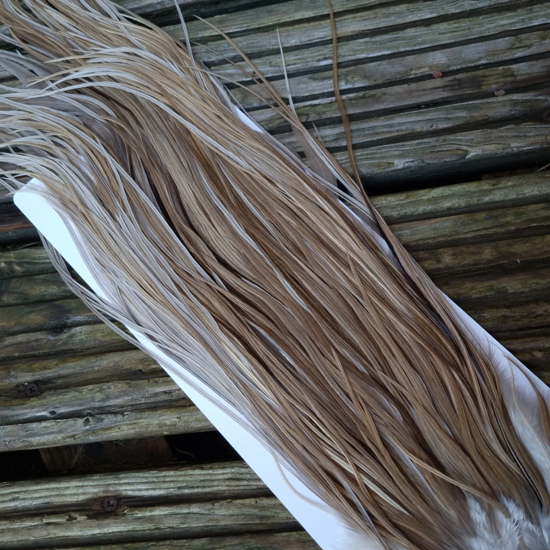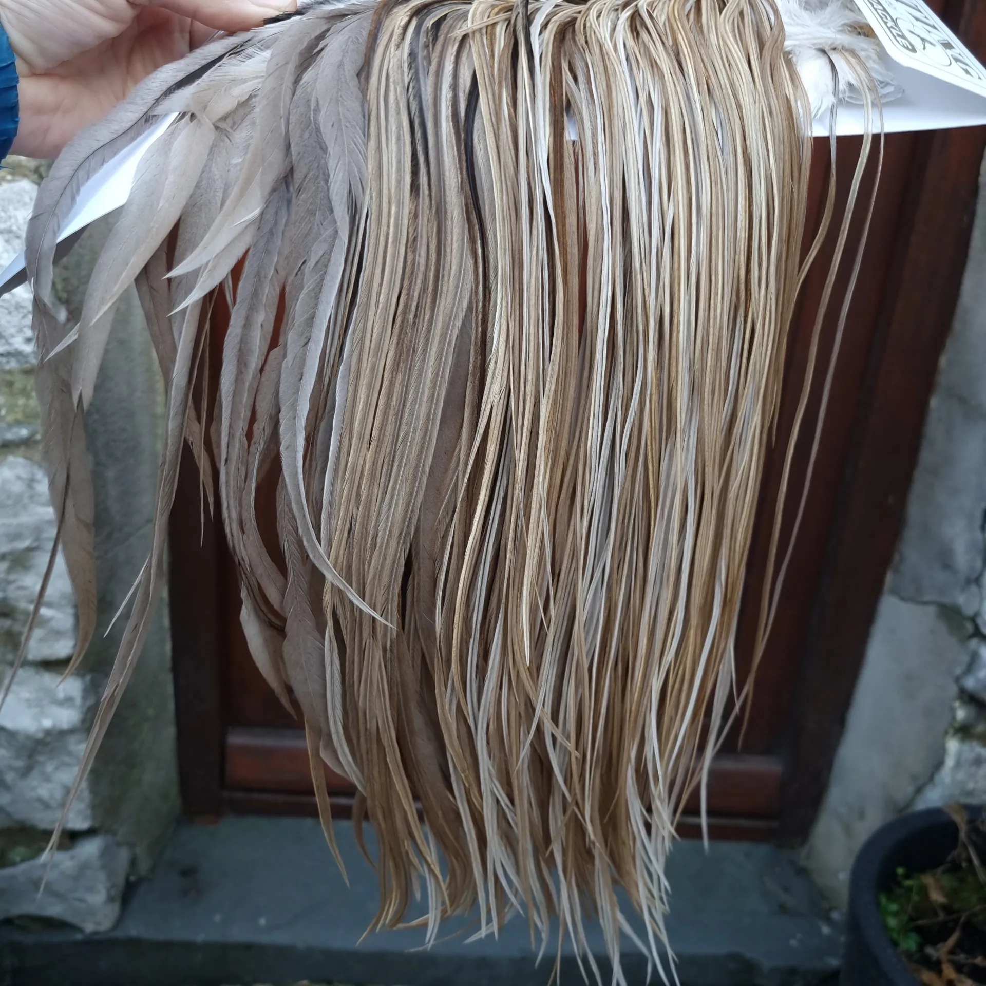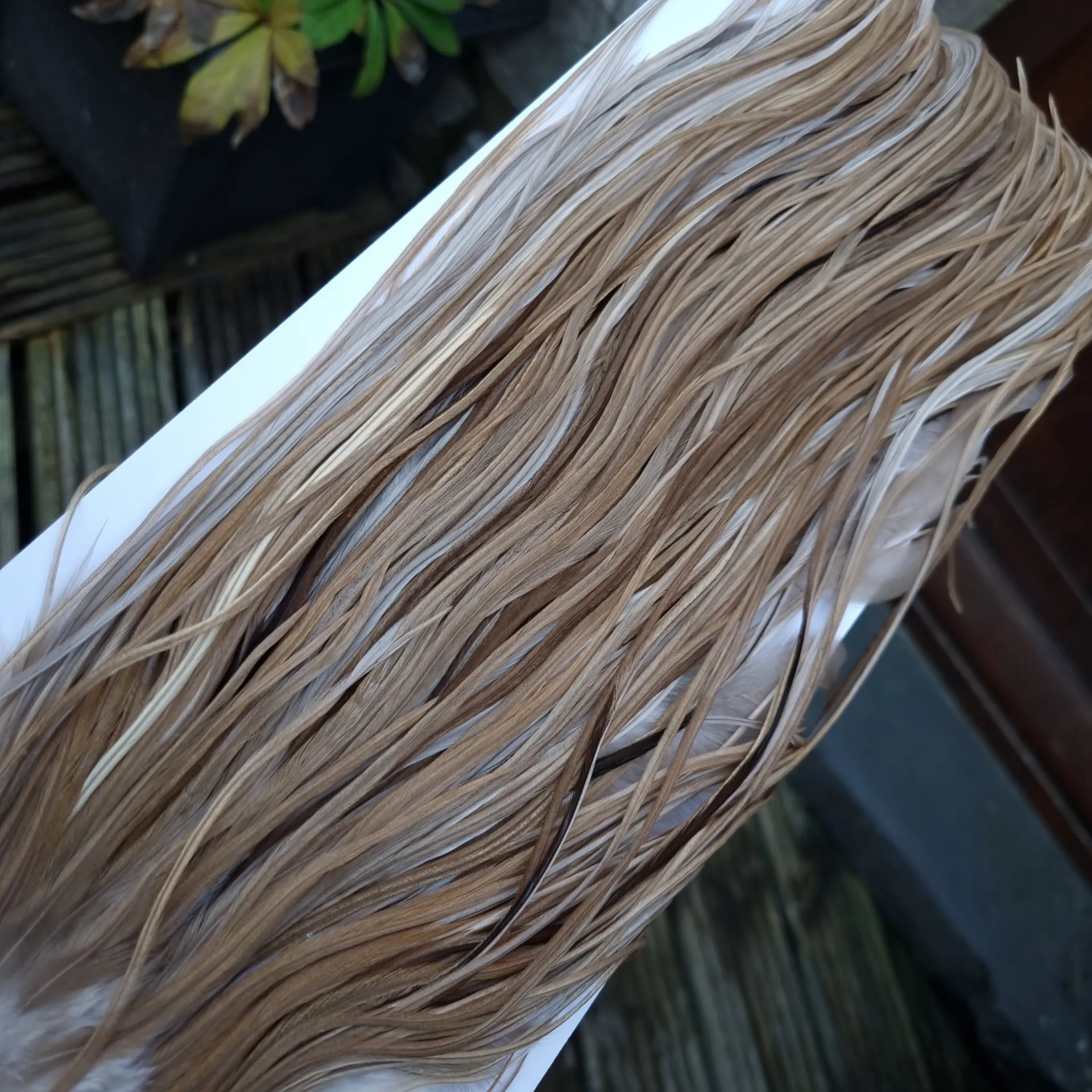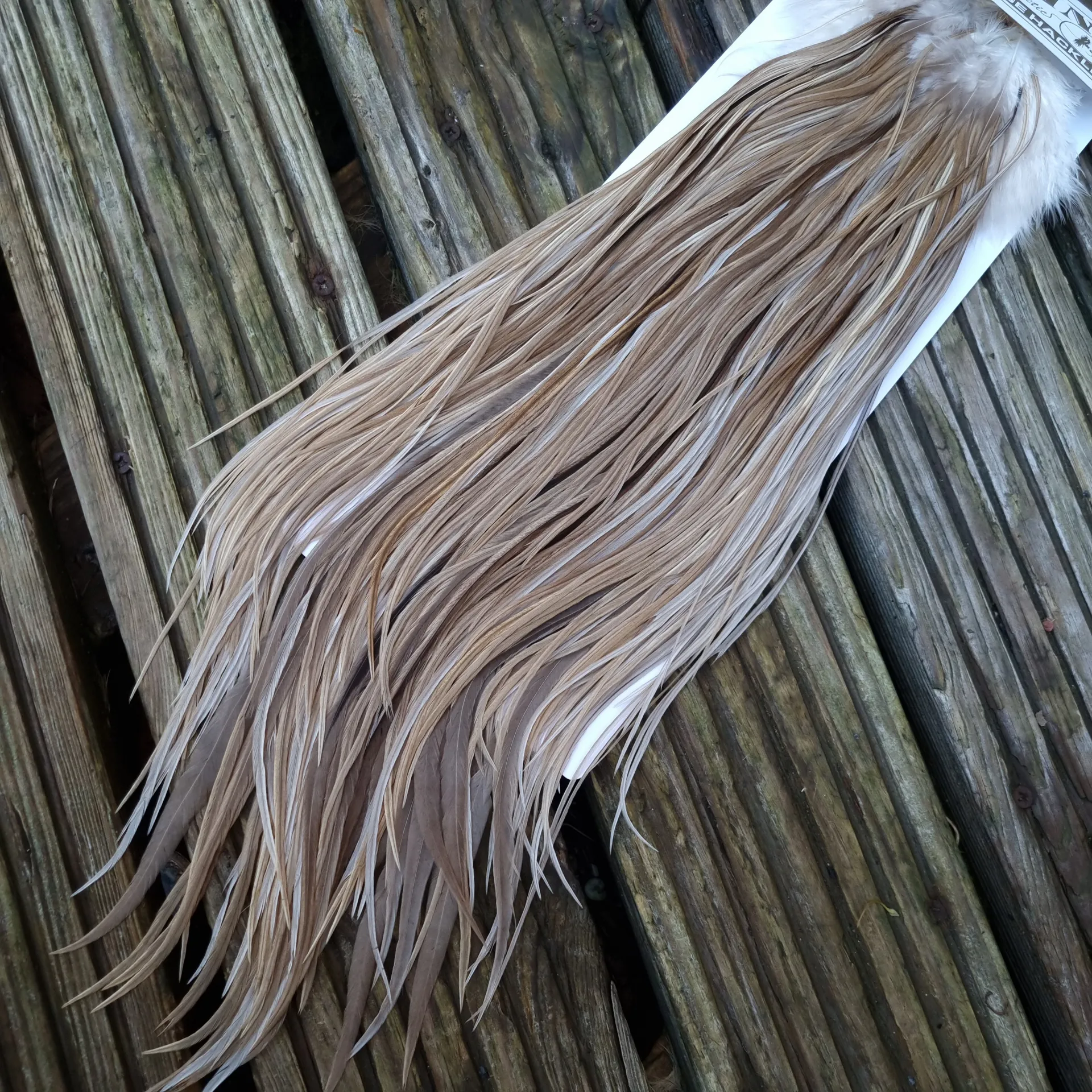 The Whiting Heritage Hackle Saddles are the colours of yesteryear from the days of Ted Hebert and Andy Miner and then the quality has been improved by Dr.Tom Whiting with his selective breeding program. The Heritage hackle is all about the most sought after hard to get colours like Speckled Badger, Speckled Duns and the Champagne range of colours and those very special Unique Variants that you only see once in a while!! Owning a Heritage Hackle Saddle is something to treasure as the colouration on most is unique with each saddle being very special in its own right.Whiting Heritage Hackles Rooster Saddle in Mixed Colours A Dun Badger/Natural Dun/Tan Dun/Sandy Dun/Dark Tan Dun Approx Tying Sizes 12/14 with the odd one either side!! OK so it comes labelled as a Badger Variant but any fly tier worth their Salt can see it rammed with Natural Dun Hackles in a big range of colours including Dun Badger BUT saddle A is offering much more than one colour because it has so many different Dun Shades Splashed across the entire saddle!!!IF YOU LOOKING FOR A COLOUR RANGE OF NATURAL DUNS THIS COULD BE THE SADDLE FOR YOU, but only if it’s giving the tying sizes you require!!! As you can seeit’sdensely hackled with hackles that average 12-19” (31-49cm) in length. Rememberyou'rebuying the saddle in the image so take your time read the sizing and scroll through all the images provided!!!