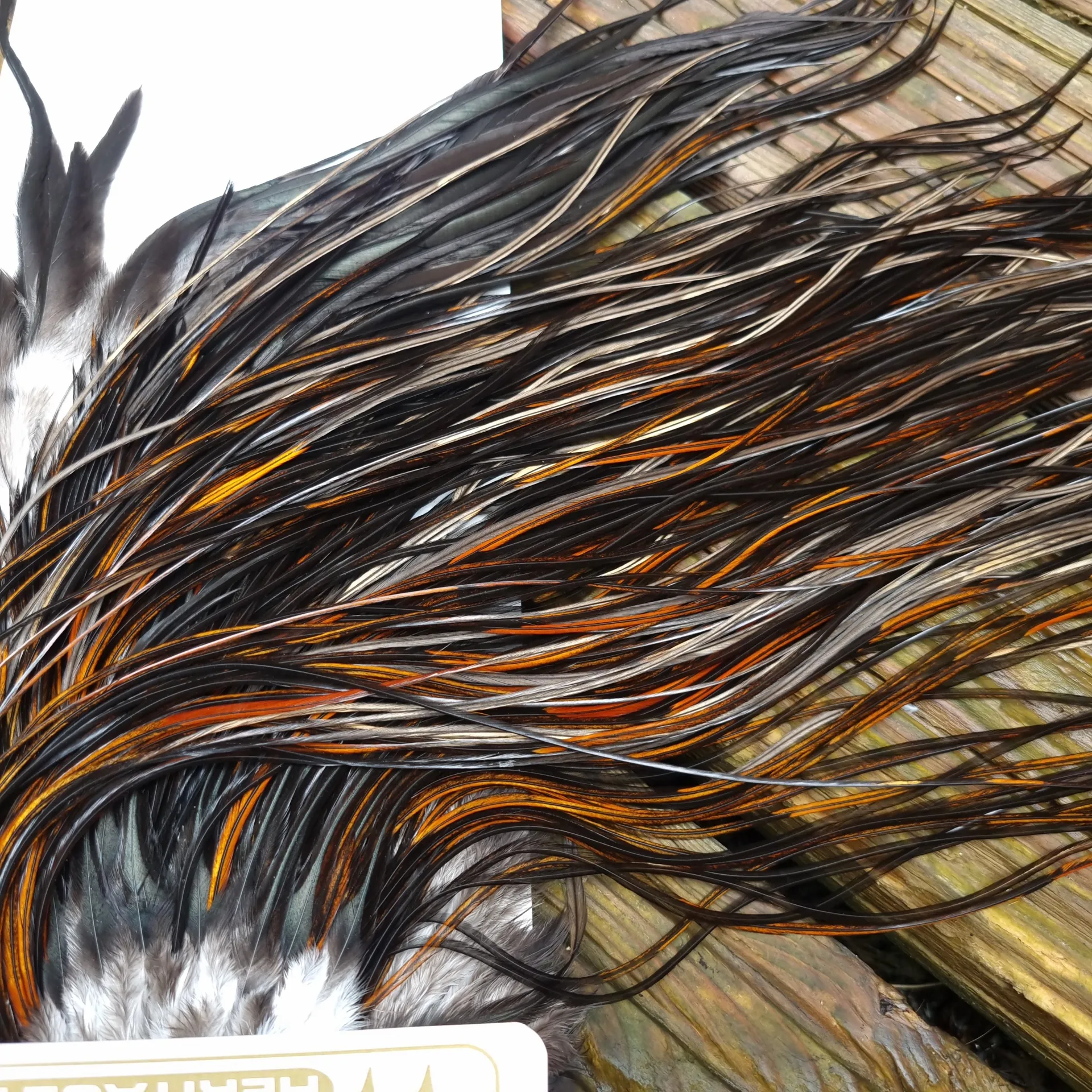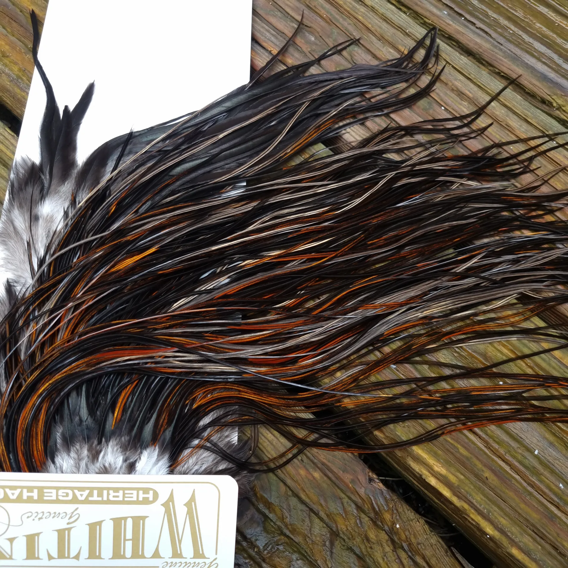 The Whiting Heritage Hackle Saddles are the colours of yesteryear from the days of Ted Hebert and Andy Miner and then the quality has been improved by Dr.Tom Whiting with his selective breeding program. The Heritage hackle is all about the most sought after hard to get colours like Speckled Badger, Speckled Duns and the Champagne range of colours and those very special Unique Variants that you only see once in a while!! Owning a Heritage Hackle Saddle is something to treasure as the colouration on most is unique with each saddle being very special in its own right.Whiting Heritage Hackles Rooster Saddle in Mixed Colours G Coch YBondhu/ Furnace/Dirty Furnace/Very Dark Chestnut/Natural Black Tying Approx 10/12/14, so this is one of those Heritage saddles that came from the Badger Variant Range and as the images show its splashed with a BIG range of Variant Furnace Hackles and plenty of Natural Black and Very Dark Chestnutbut to be honest it’s one of those saddle that the more you look the more unique hackles you will find so take a good look at all the images provided and use your phone to zoom in so you can spot the colour range!! Hackle length is approx. 12-17" (31-43cm) on a densely hackled saddle. Remember this is a buy what you see product range.