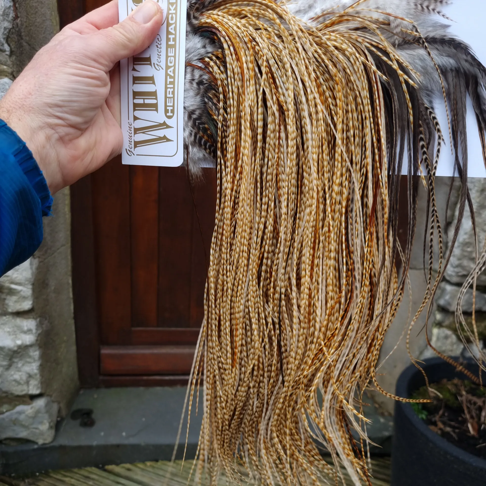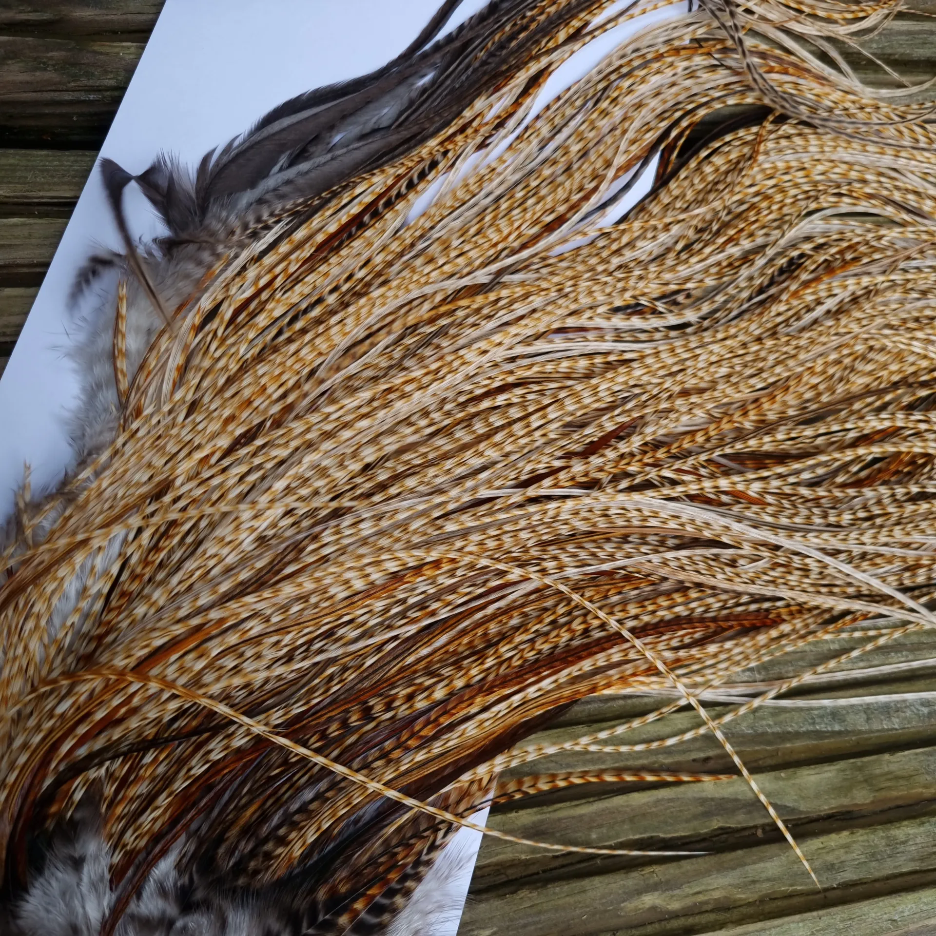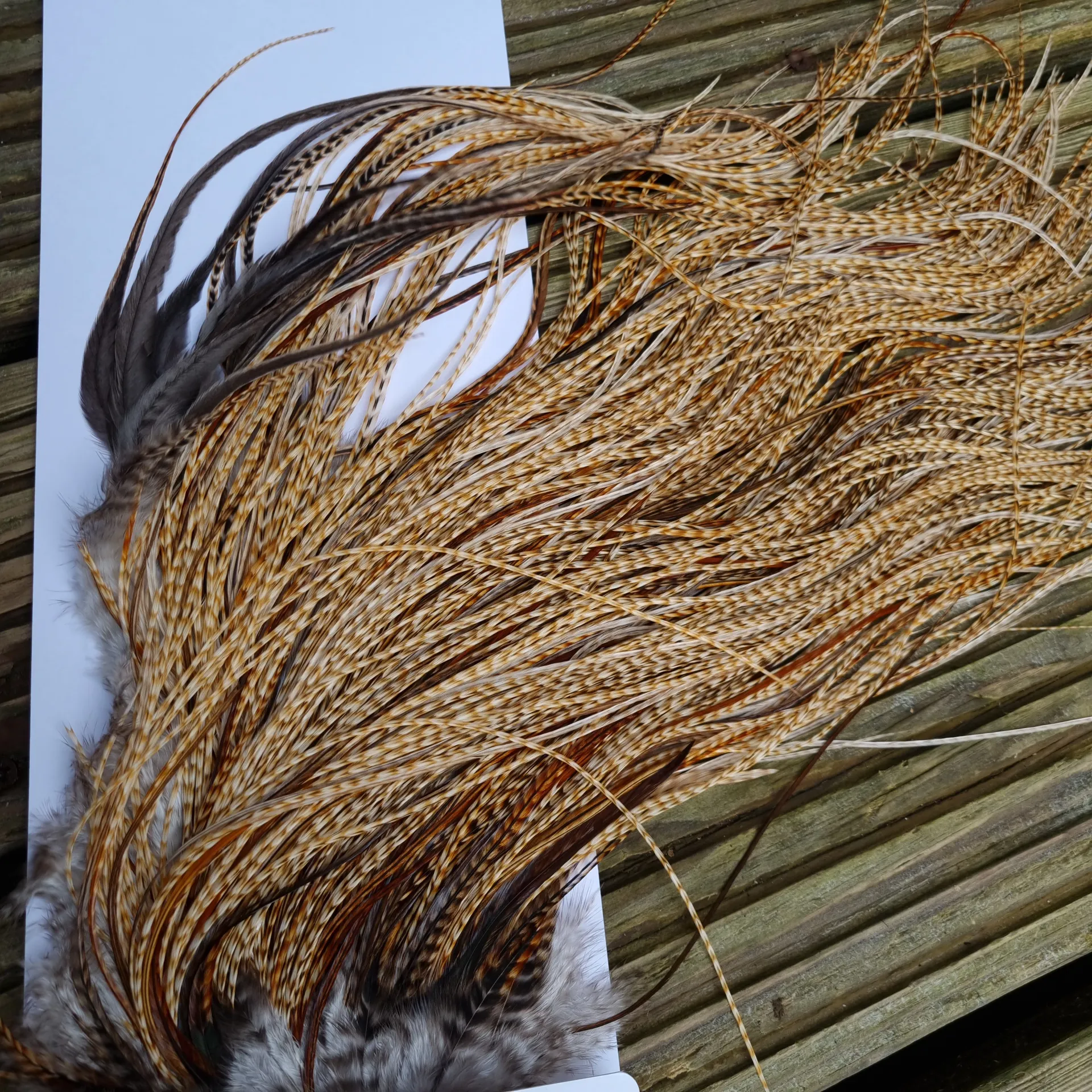 Whiting Heritage Hackles Rooster Saddle in Mixed Colours K Barred Medium Ginger/Brassy Dun/Furnace/Greenwell’sTying Approx Some 12 and STUFFED with 14/16/18.Wow what a saddle and again it’s about the depth of colour of these Medium to Dark Barred Ginger Hackles with so many having a dark fleck to the hackle that are making them soSpecial, these aren’t any old barred ginger hackles these are Heritage Barred Ginger Hackles that have that typical twist to the colour plus you get a GOOD SplashingFurnace/Greenwell’s Variant hackles on this VERY DENSELY Hackled Saddle with hackles that are 13-19" approx. Take a good look at all the images provided. Remember you buy the saddle in the image atLakeland!!!!