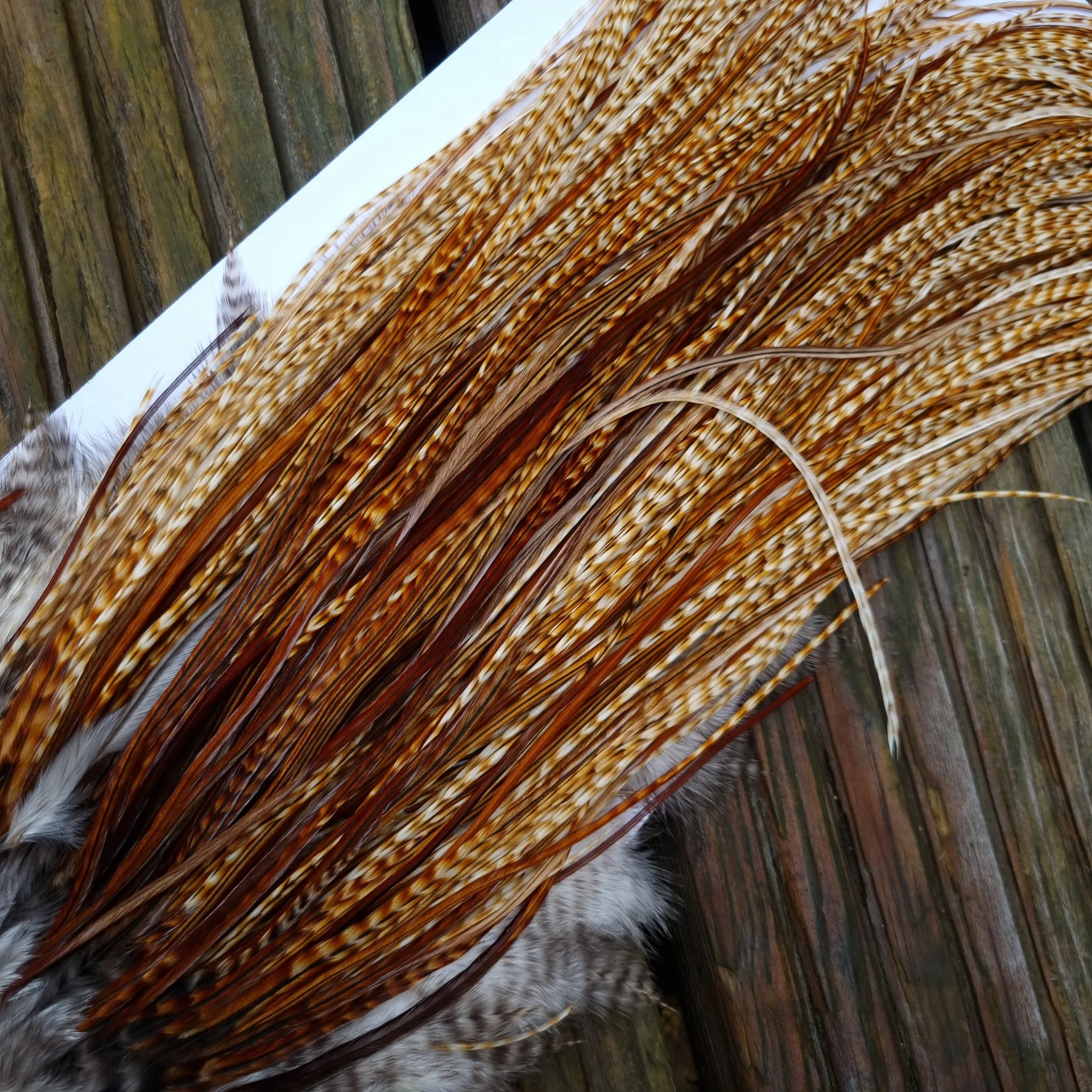 The Whiting Heritage Hackle Saddles are the colours of yesteryear from the days of Ted Hebert and Andy Miner and then the quality has been improved by Dr.Tom Whiting with his selective breeding program. The Heritage hackle is all about the most sought after hard to get colours like Speckled Badger, Speckled Duns and the Champagne range of colours and those very special Unique Variants that you only see once in a while!! Owning a Heritage Hackle Saddle is something to treasure as the colouration on most is unique with each saddle being very special in its own right.Whiting Heritage Hackles Rooster Saddle in Mixed Colours M Light/Medium and Dark Barred Ginger with a good splashing of Brassy Dun and a few Furnace down the centre Approx tying sizes 14/16/18. WOW what a stunning saddle, this really is abeautywith colour getting darker and stronger as you go to the centre of the saddle with a band of brassy Dun and a few Furnace down the centre. If you want special this could be the one for youso take a good look at all the images provided.Densely Hackled with hackles that average 12-18” (30-46cm) in length!!! !!!Remember your BUYING THE SADDLE IN THE IMAGE with the Heritage Range!!!!