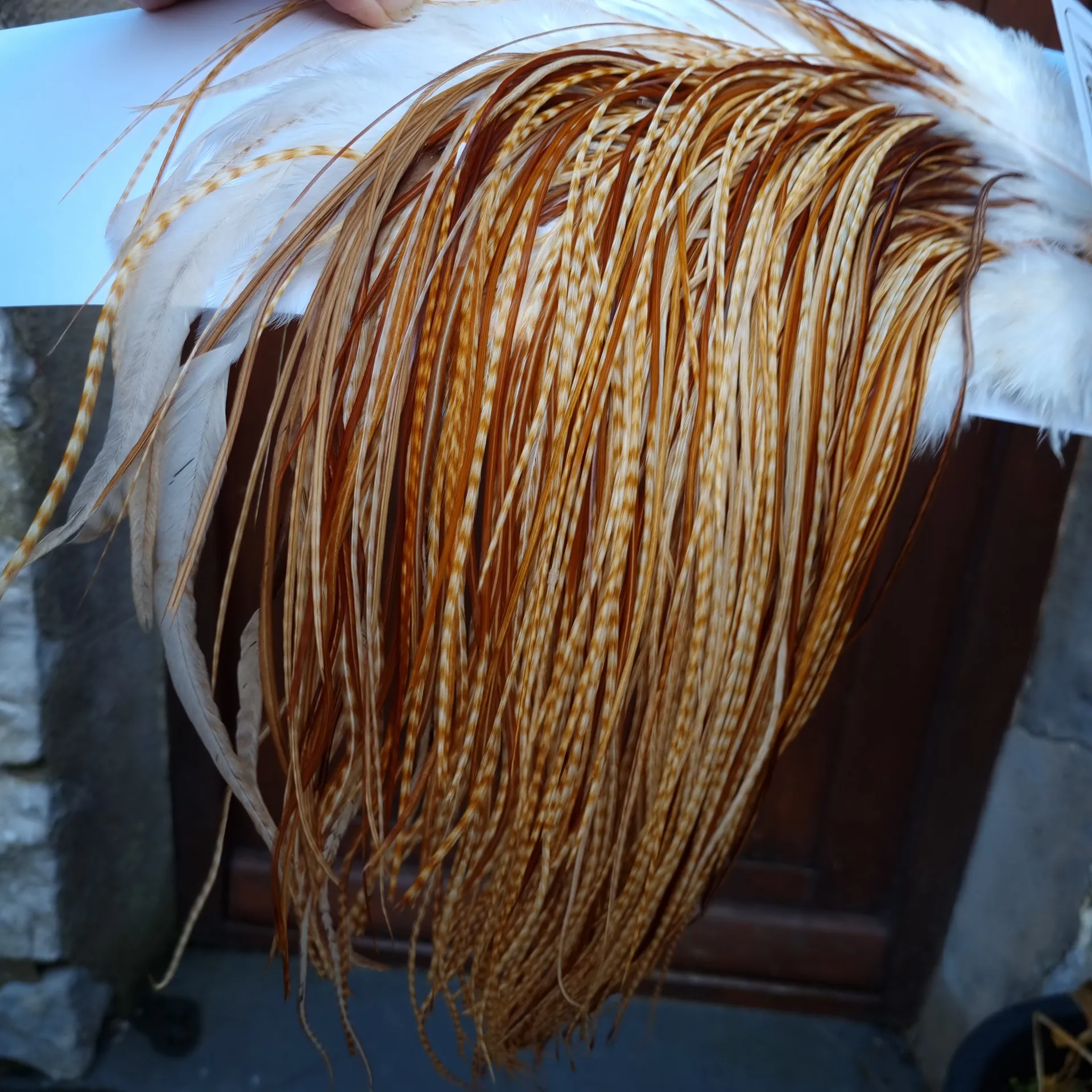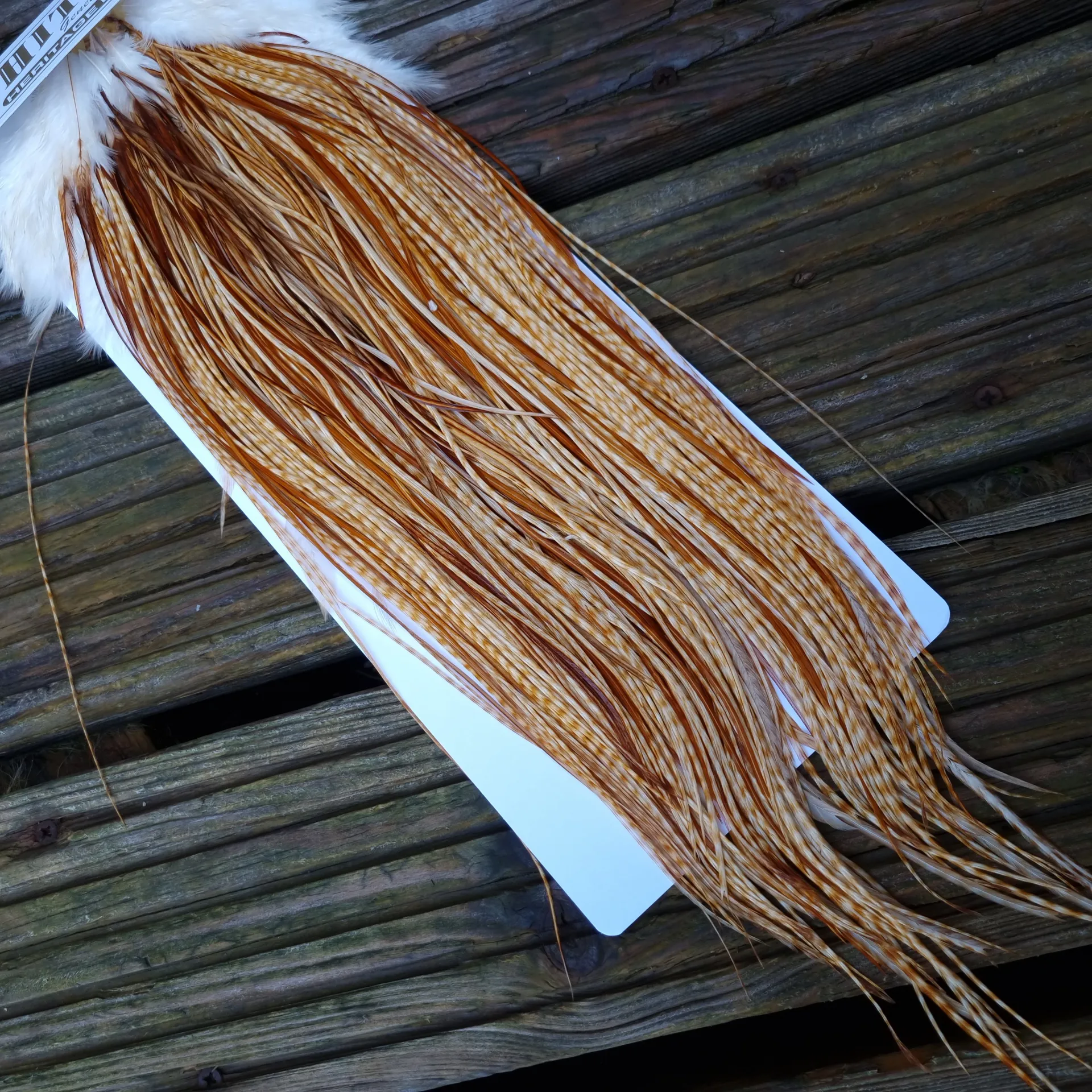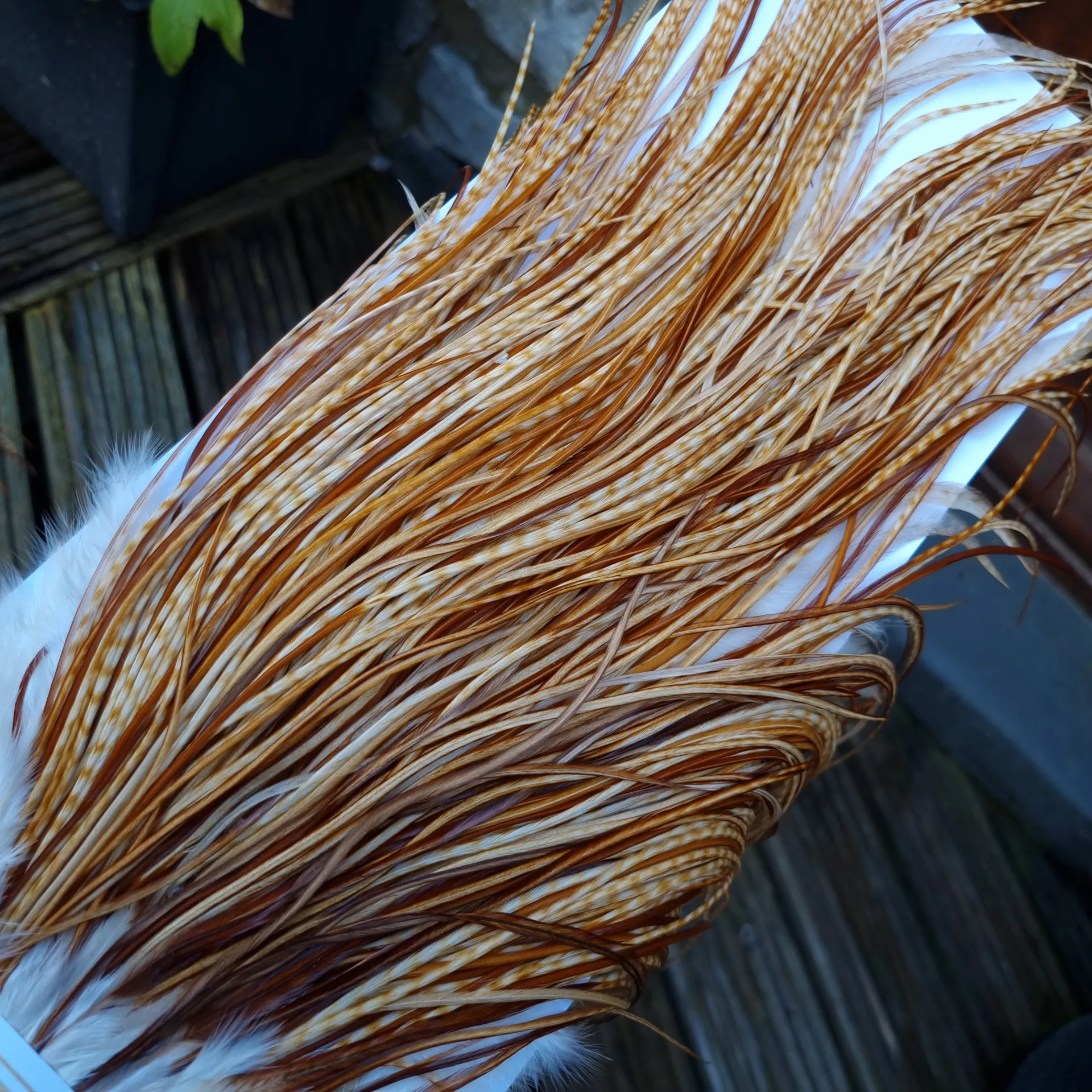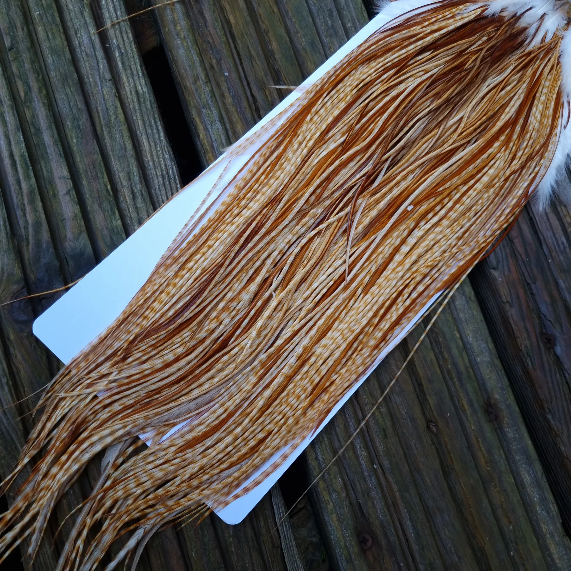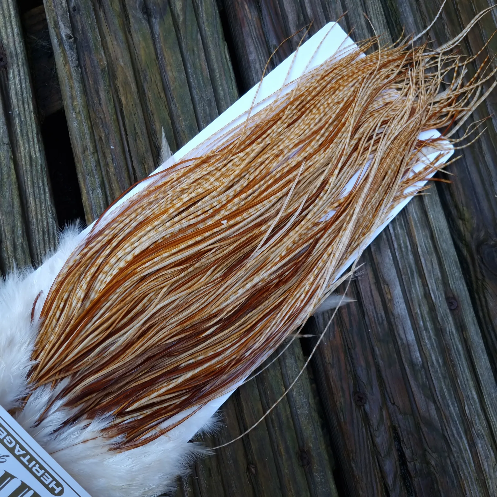 Whiting Heritage Hackles Rooster Saddle in Mixed Colours R Barred Ginger Splashed with Light, Medium and Dark Ginger Hackles Approx Tying Size Few 12 STUFFED with 14/16 and a few smaller. Saddle R will deliver a FULL range of Ginger Shades and in the right fishing sizes. Like all Heritage Saddles the colours are second to none, rich in colour with bold hackle markings!!! With hackles that average 12-17” (31-43cm) Pour a coffee and look at all the images provided to see the true beauty of this saddle. Remember You're Buying the Saddle in the Image!!!