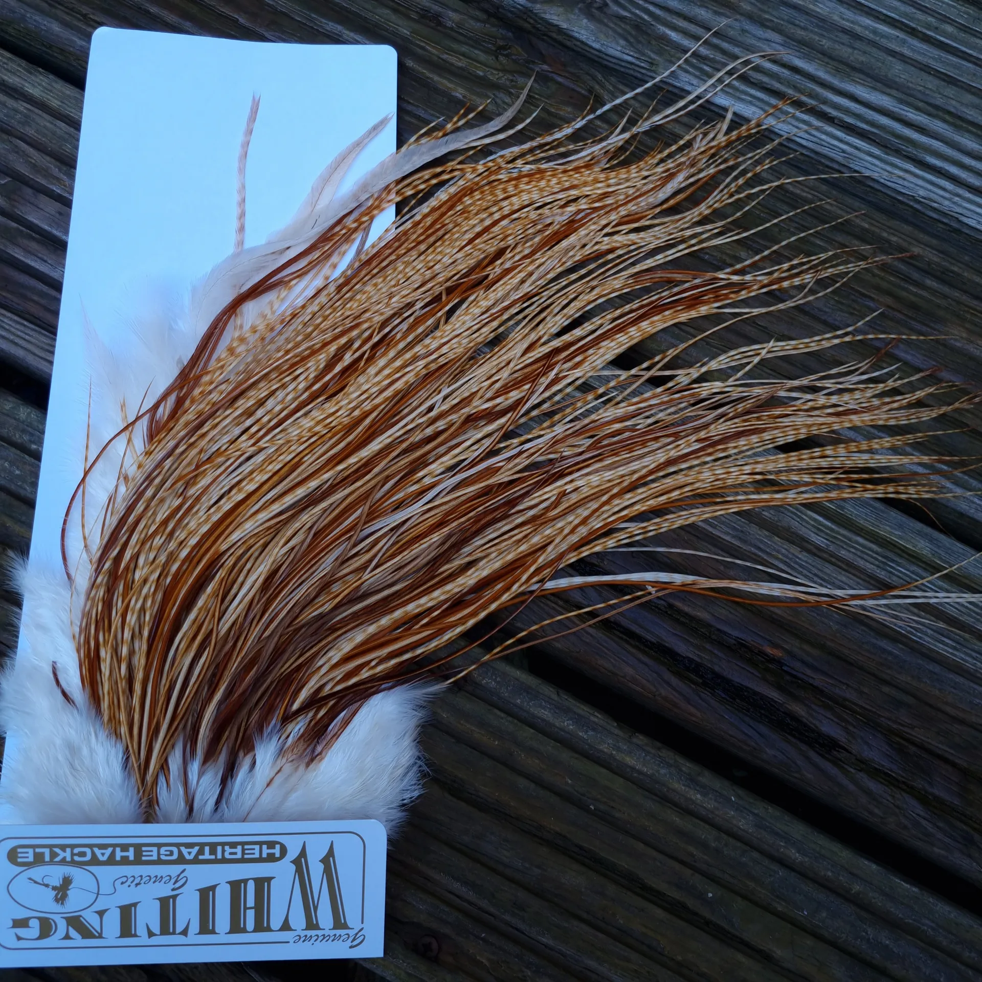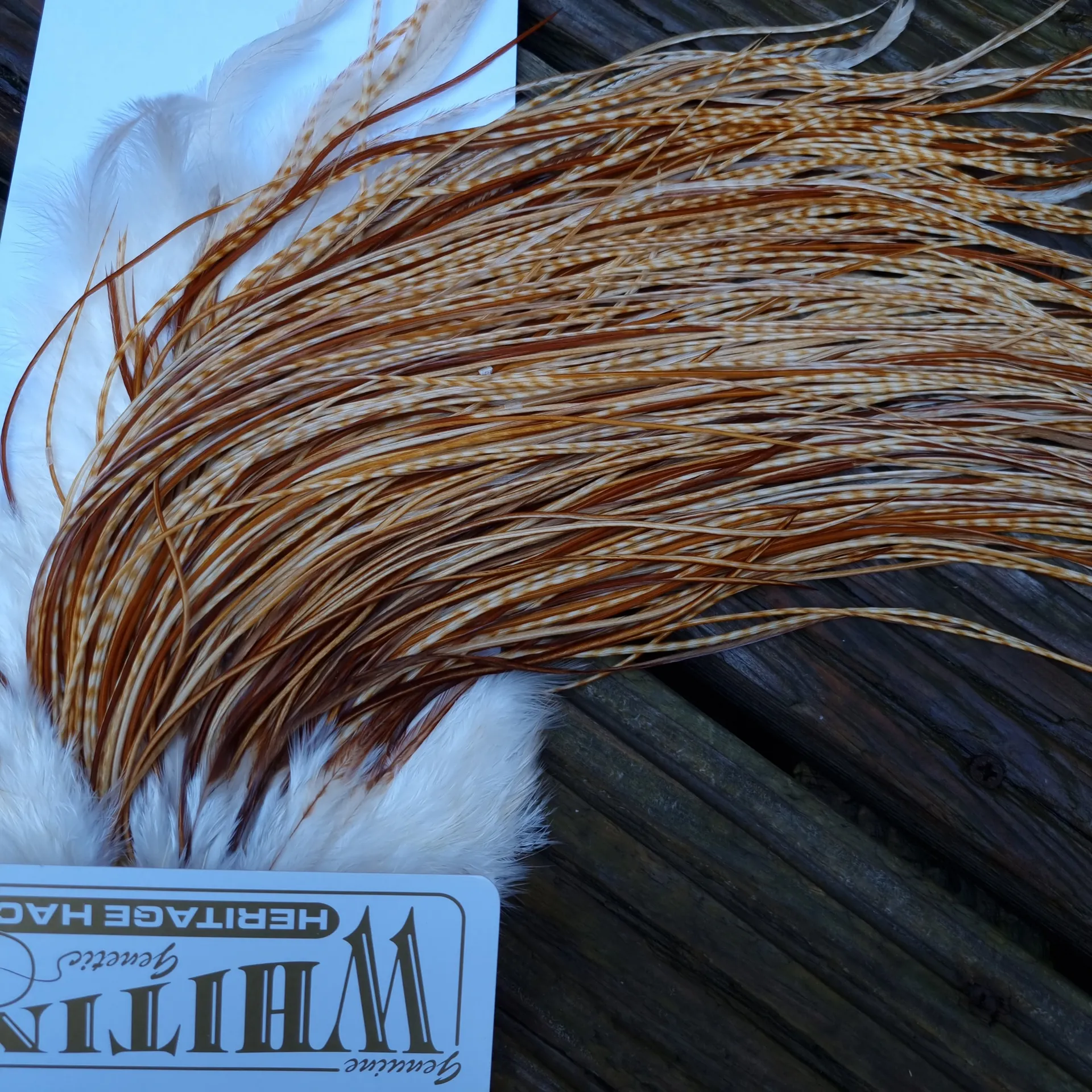 The Whiting Heritage Hackle Saddles are the colours of yesteryear from the days of Ted Hebert and Andy Miner and then the quality has been improved by Dr.Tom Whiting with his selective breeding program. The Heritage hackle is all about the most sought after hard to get colours like Speckled Badger, Speckled Duns and the Champagne range of colours and those very special Unique Variants that you only see once in a while!! Owning a Heritage Hackle Saddle is something to treasure as the colouration on most is unique with each saddle being very special in its own right.