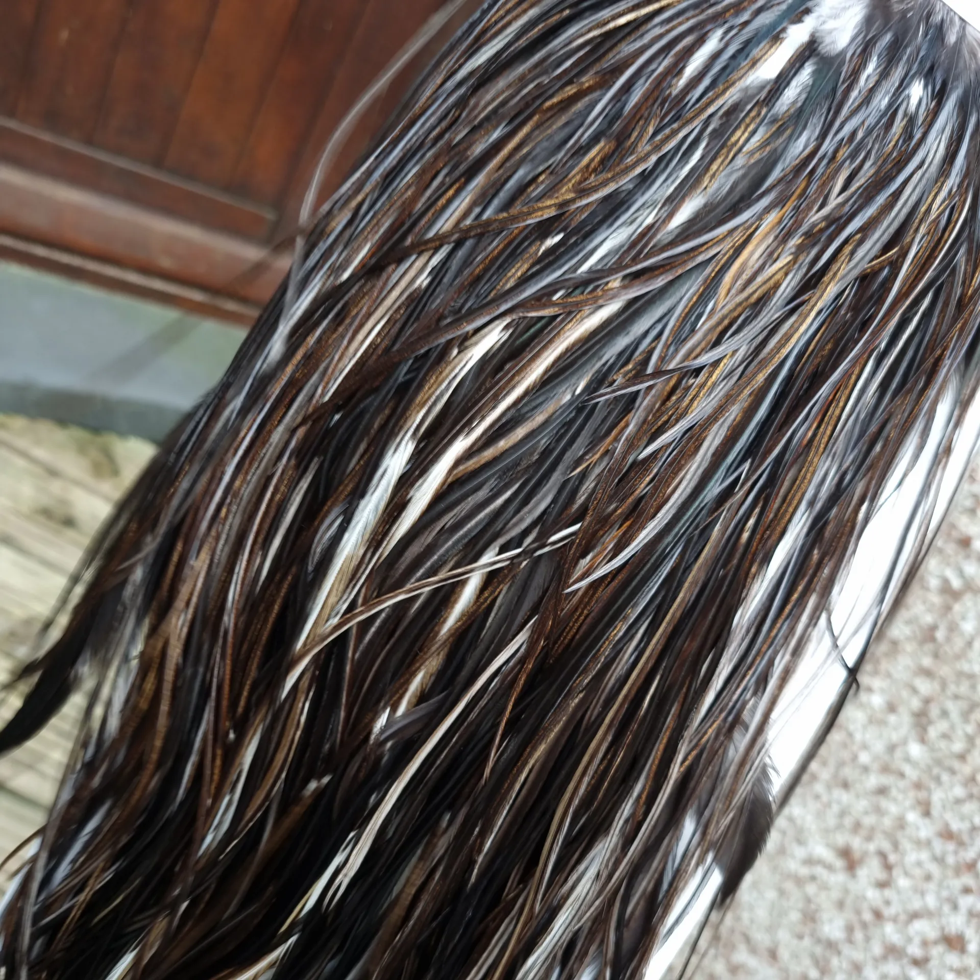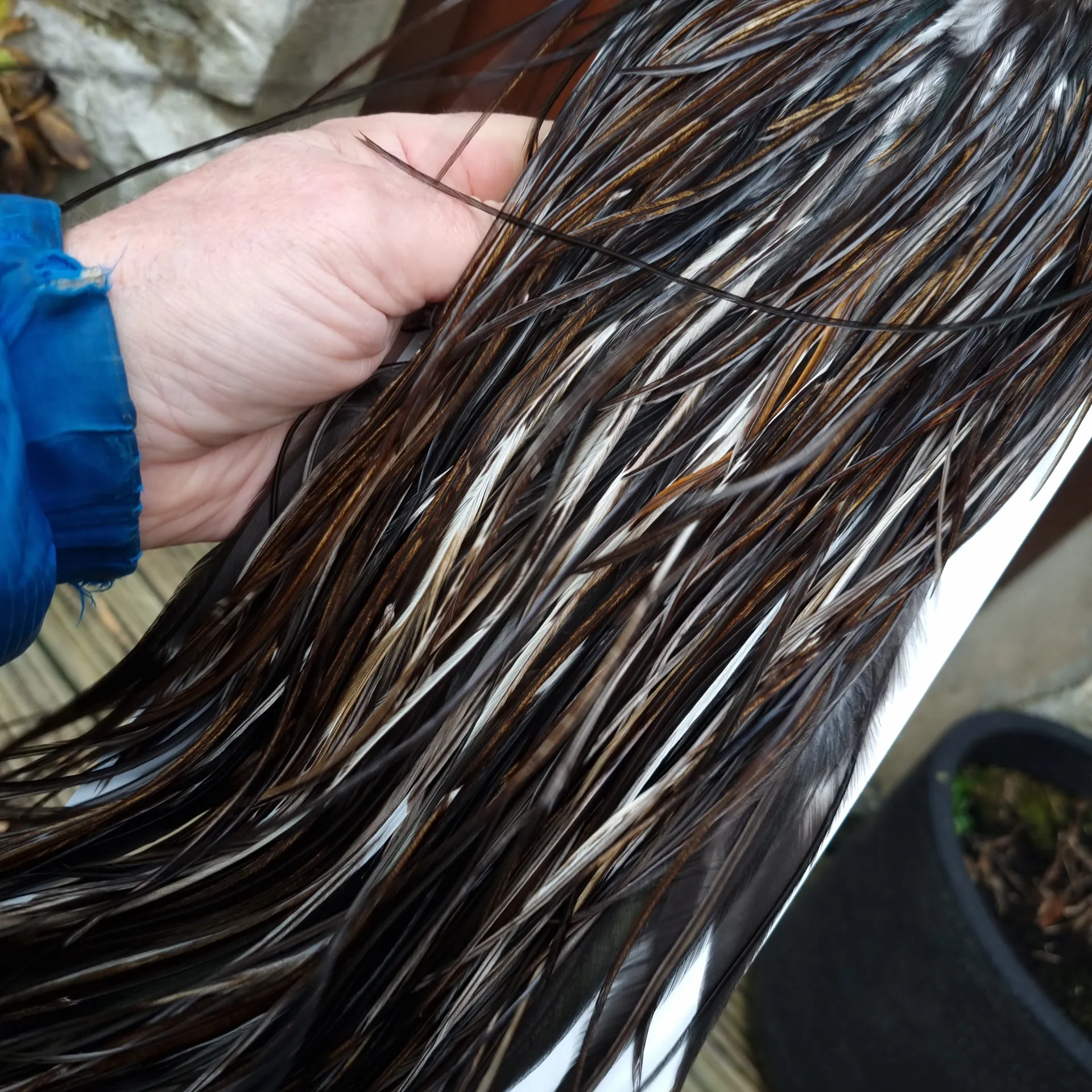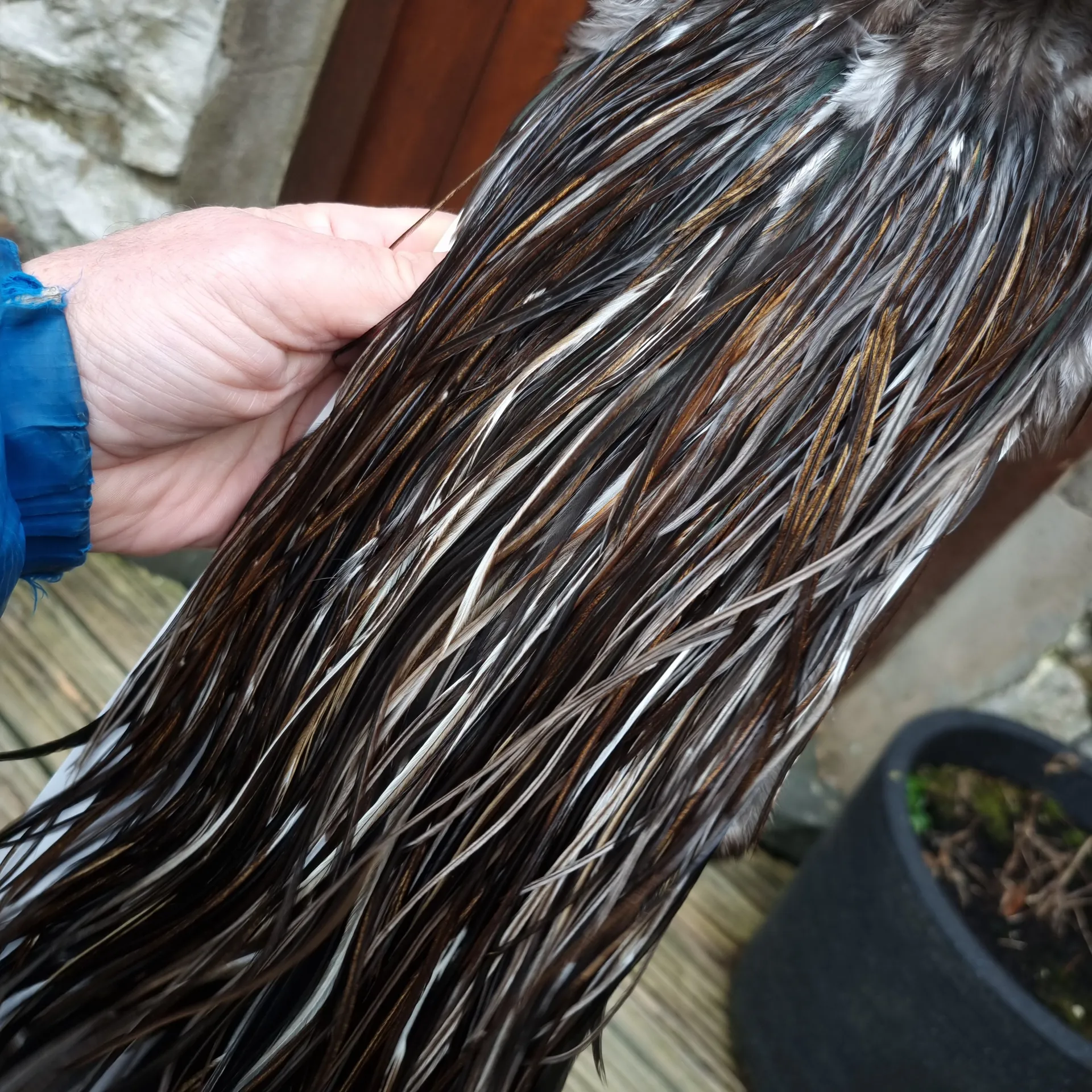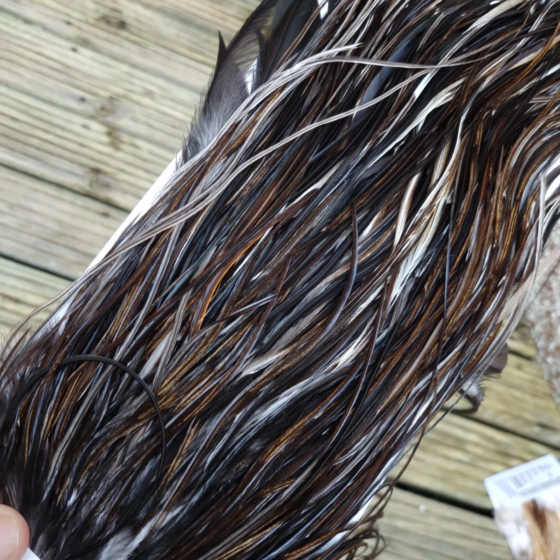 The Whiting Heritage Hackle Saddles are the colours of yesteryear from the days of Ted Hebert and Andy Miner and then the quality has been improved by Dr.Tom Whiting with his selective breeding program. The Heritage hackle is all about the most sought after hard to get colours like Speckled Badger, Speckled Duns and the Champagne range of colours and those very special Unique Variants that you only see once in a while!! Owning a Heritage Hackle Saddle is something to treasure as the colouration on most is unique with each saddle being very special in its own right.Whiting Heritage Hackles Rooster Saddle in Mixed Colours S Very Dark Chocolate Brown, VERY Dark Speckled Badger, Speckled Badger and splashed Unique Variant Hackles Approx Tying Sizes 12/14/16. Ok as the images show saddle S is very dark,but when you look deeper it is full of colour and you will find the Very Dark Chocolate Brown, VERY Dark Speckled Badger, Speckled Badger and splashed Unique Variant Hackles splashed across the saddle!!Hackle length is long on this Bad Boy we are talking approx. 12-20"so each hackle will tie plenty of flies. Remember you're buying the saddle in the image.