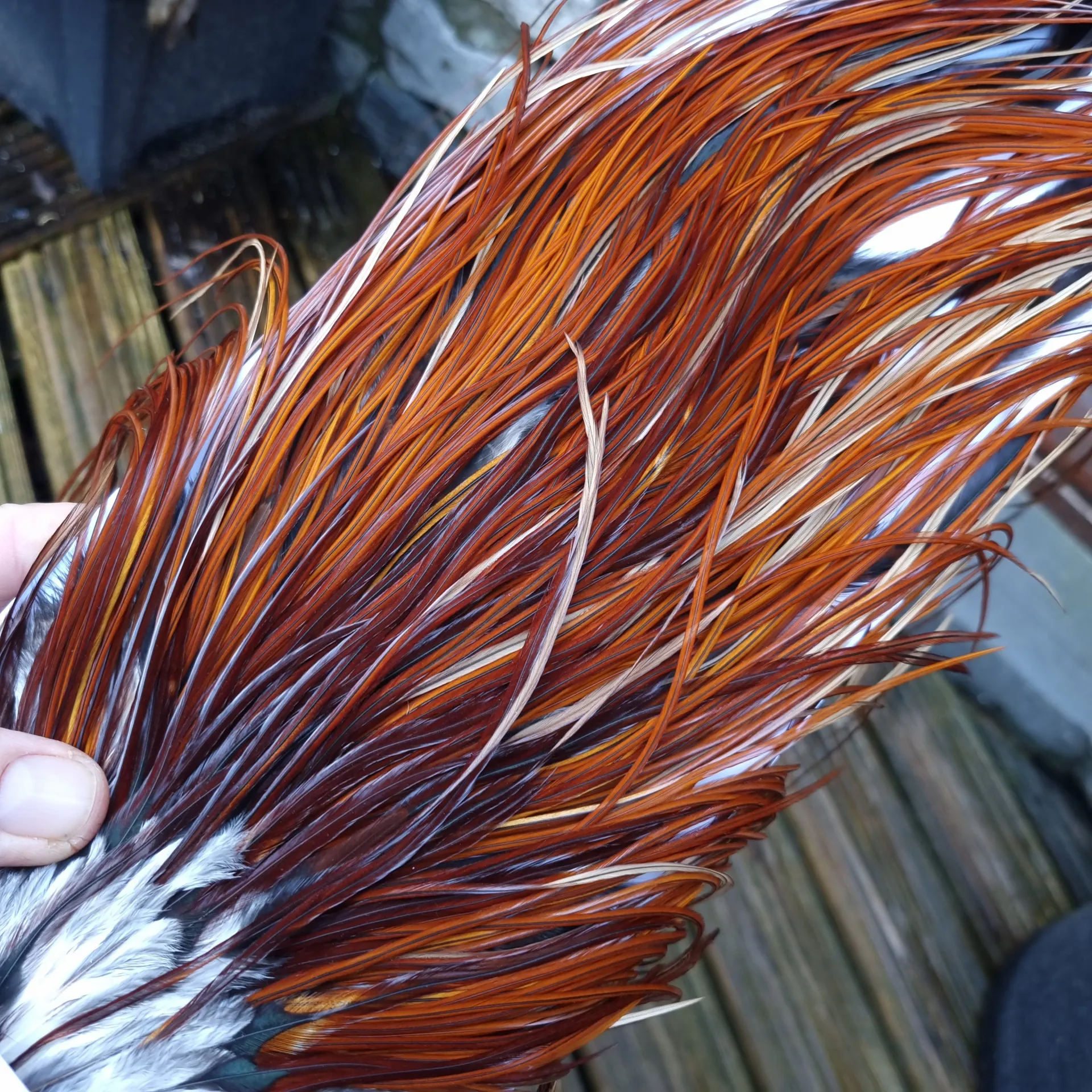 Whiting Farms produce by far the very best Dry Fly Saddle hackles in the world with hackles that can reach 20 “ or more!! Just like the legendary Whiting Dry Fly Capes Whiting Rooster Saddles are graded by the medal system with Platinum being the panicle of genetic breeding followed by Gold, Silver, Bronze and PRO-GRADE with saddles being graded on saddle size, Density of hackle and length of hackle and within in this they are split into a standard Gold, Silver, Bronze or Pro-Grade saddle and Midge Sized Saddles predominately tying 16 into the 20’s or smaller.