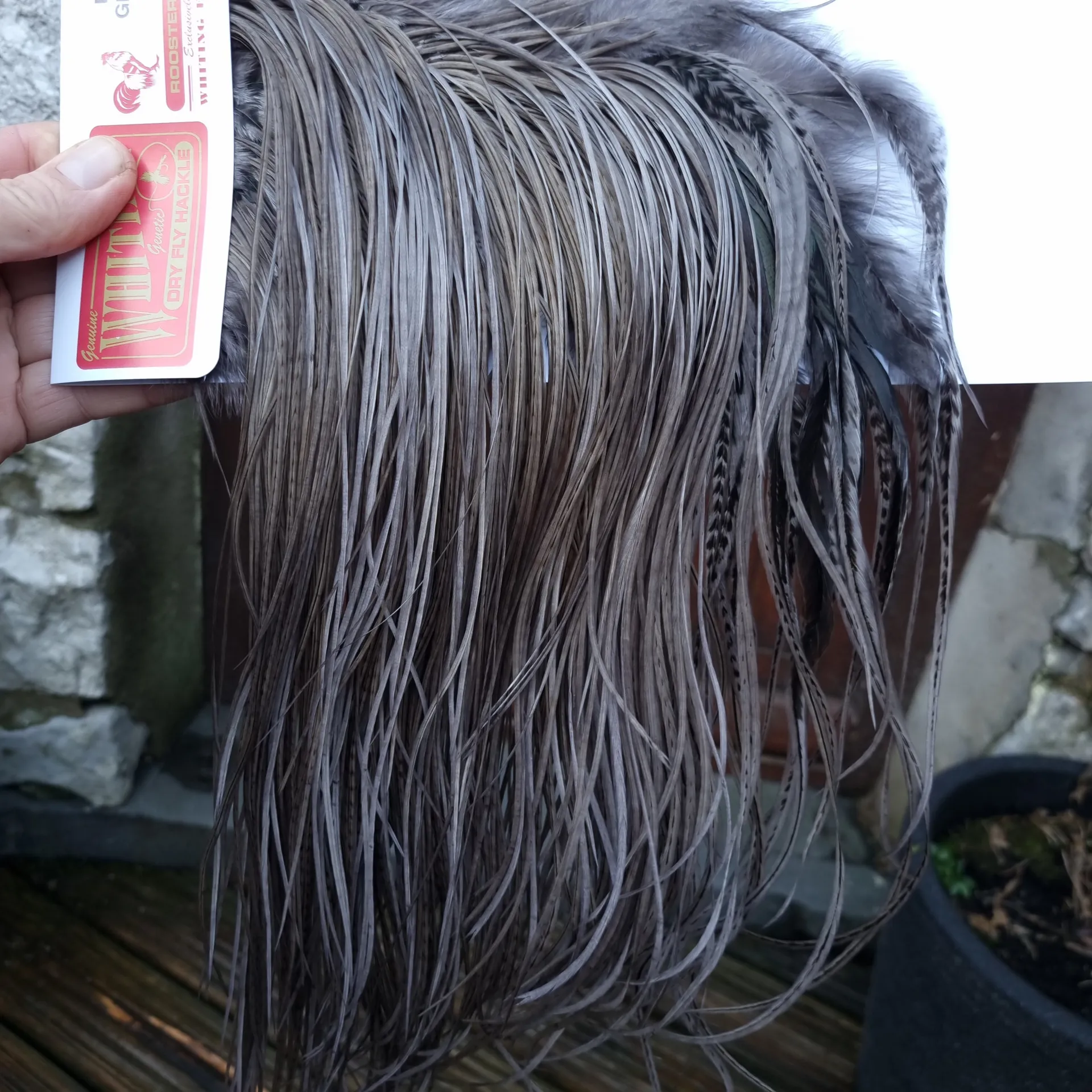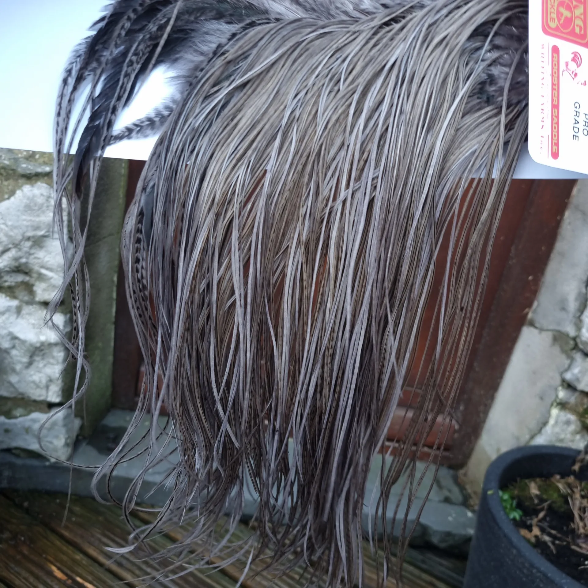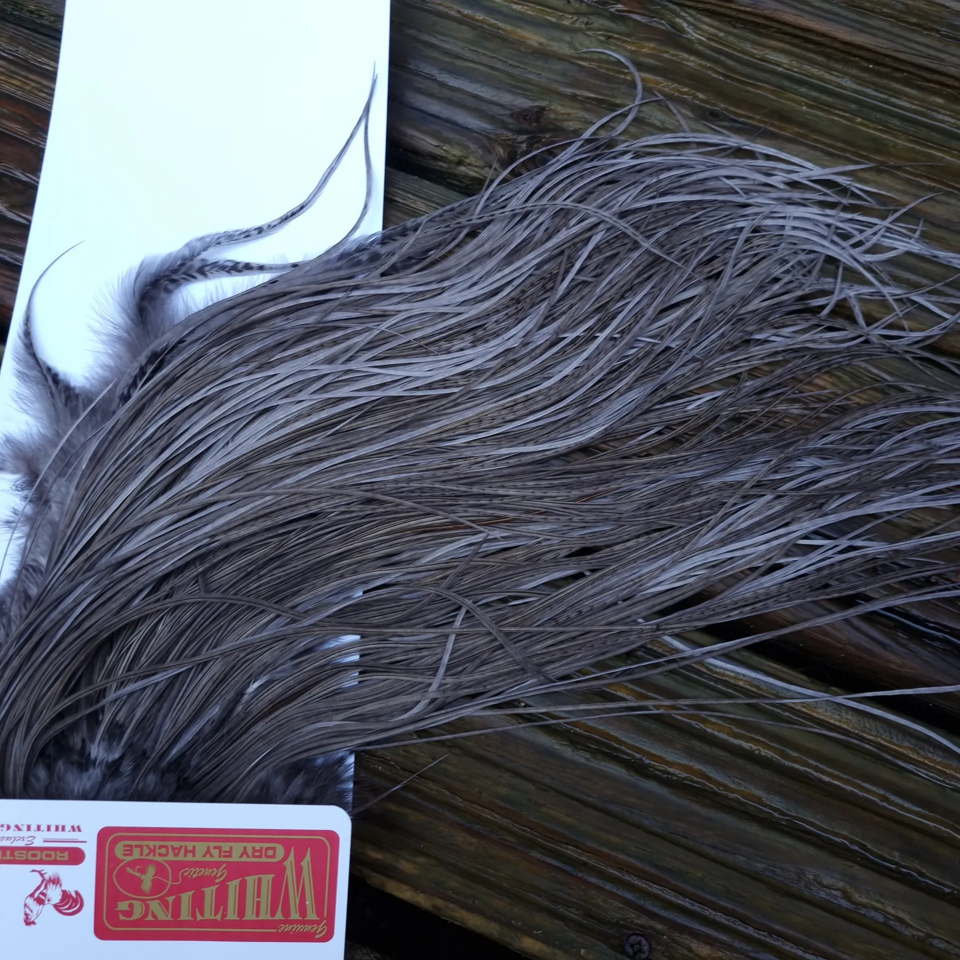 Whiting Farms produce by far the very best Dry Fly Saddle hackles in the world with hackles that can reach 20 “ or more!! Just like the legendary Whiting Dry Fly Capes Whiting Rooster Saddles are graded by the medal system with Platinum being the panicle of genetic breeding followed by Gold, Silver, Bronze and PRO-GRADE with saddles being graded on saddle size, Density of hackle and length of hackle and within in this they are split into a standard Gold, Silver, Bronze or Pro-Grade saddle and Midge Sized Saddles predominately tying 16 into the 20’s or smaller.