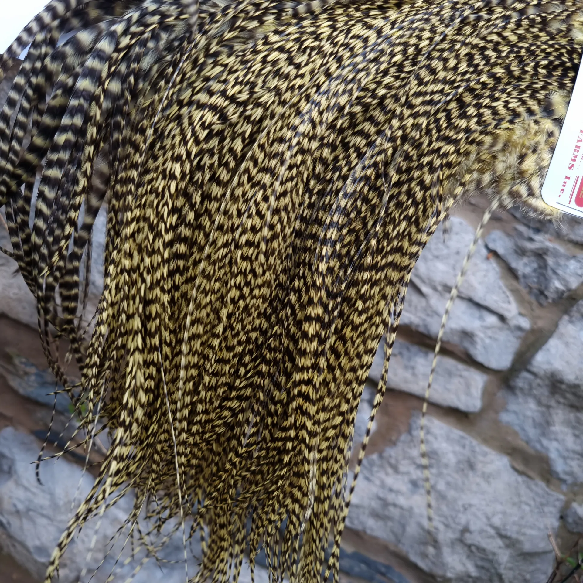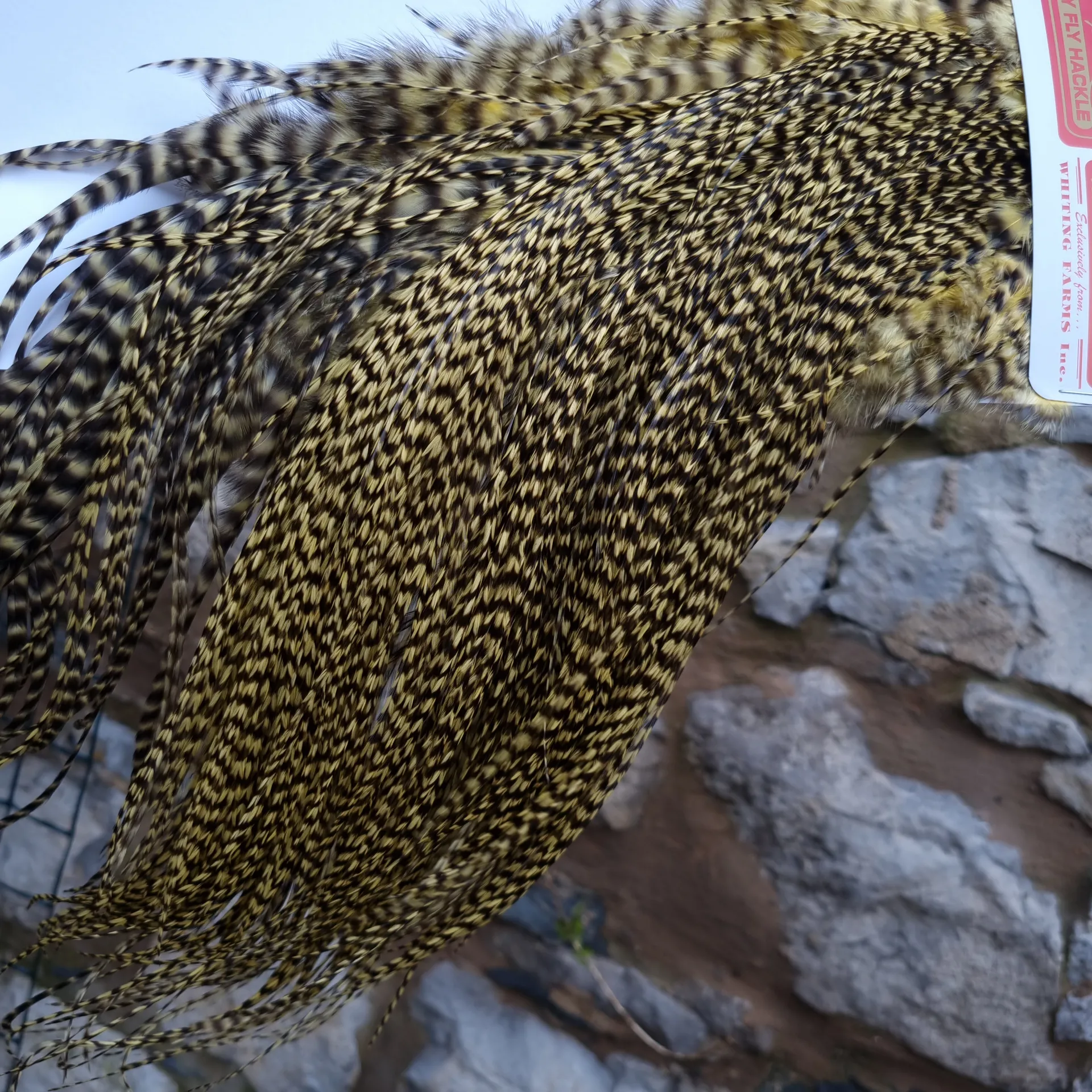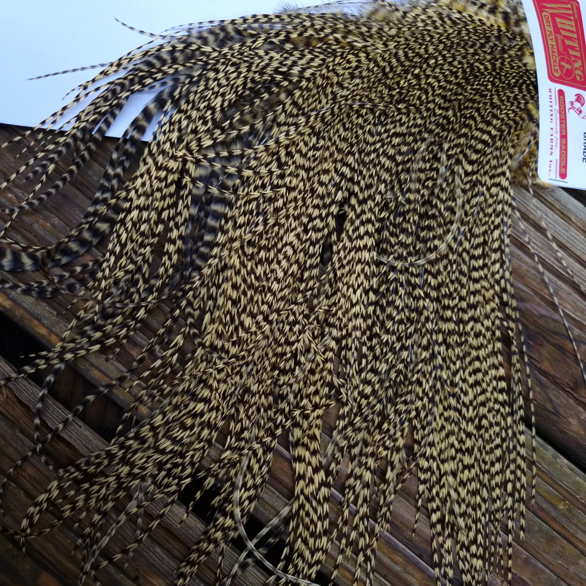 Whiting Farms produce by far the very best Dry Fly Saddle hackles in the world with hackles that can reach 20 “ or more!! Just like the legendary Whiting Dry Fly Capes Whiting Rooster Saddles are graded by the medal system with Platinum being the panicle of genetic breeding followed by Gold, Silver, Bronze and PRO-GRADE with saddles being graded on saddle size, Density of hackle and length of hackle and within in this they are split into a standard Gold, Silver, Bronze or Pro-Grade saddle and Midge Sized Saddles predominately tying 16 into the 20’s or smaller.