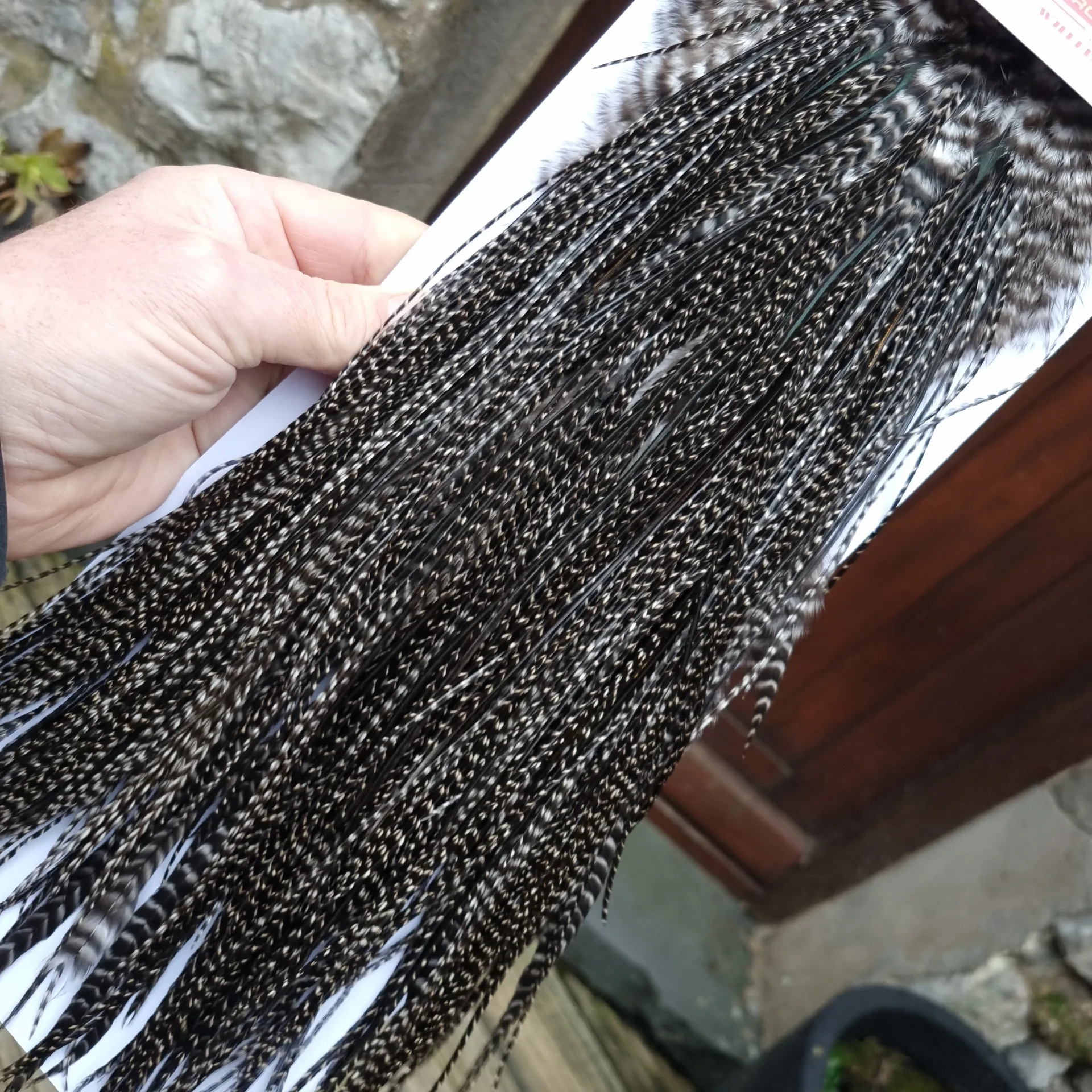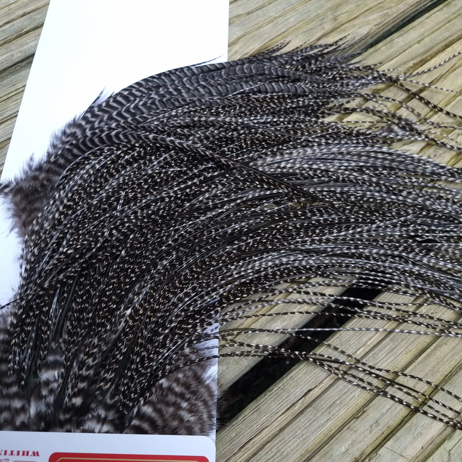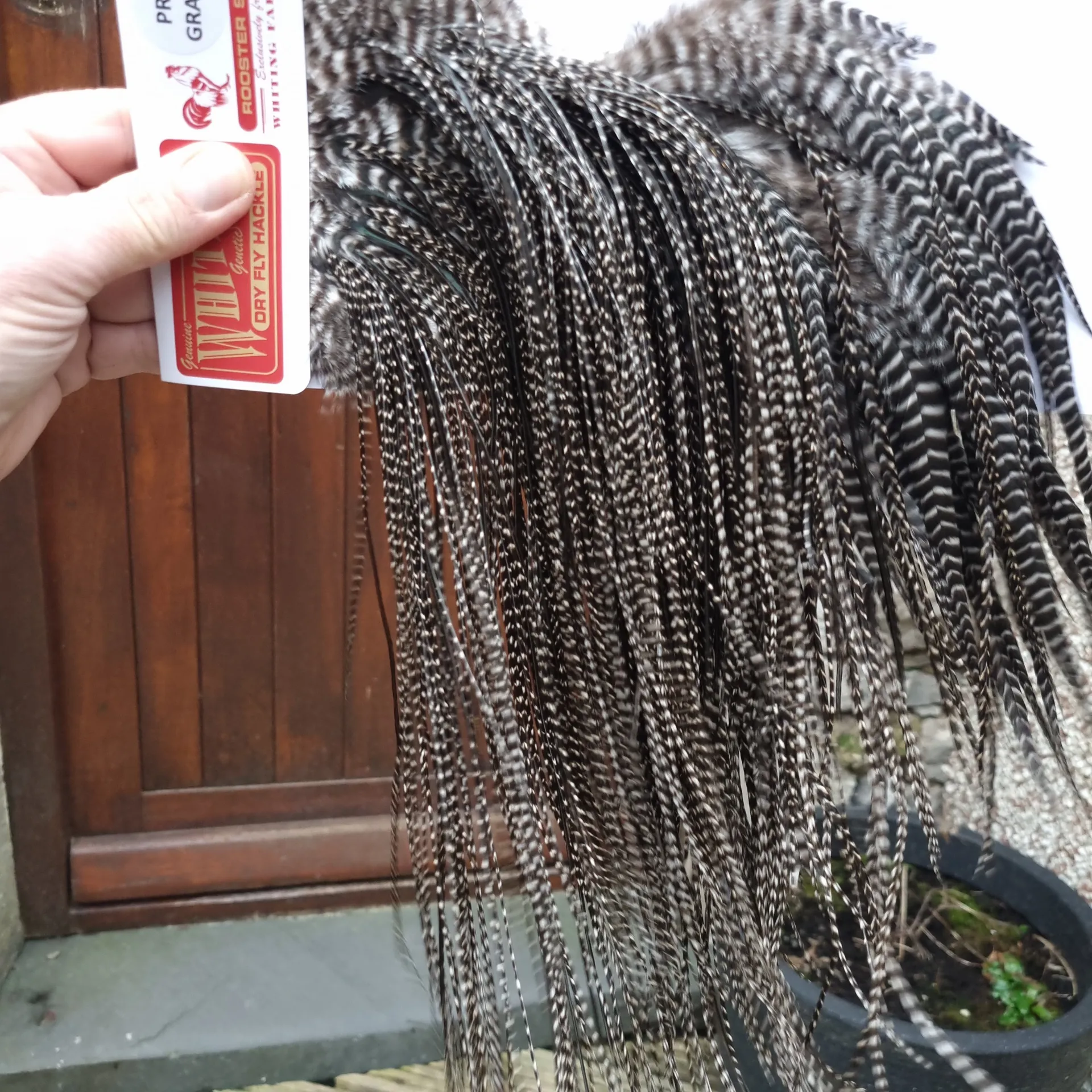 Whiting Pro-Grade Midge Rooster Saddle in Grizzly Variant A, VERY DARK GRIZZLY Approx. Tying Sizes 14/16/18/20. Grizzly Variant A is a VERY DARK GRIZZLY and it’s a CRACKER with very stiff shiny hackles with hackle barbs that are laying very tight to the quill!!!! When you first look at the saddle you will think old nige as sized it wrong but NO once you bend the hackles hard those fibres will pop up so what looked like a 24 is suddenly an18!!!!If you want DARK GRIZZLY with aHigh Quality Hackle this is the one!!!