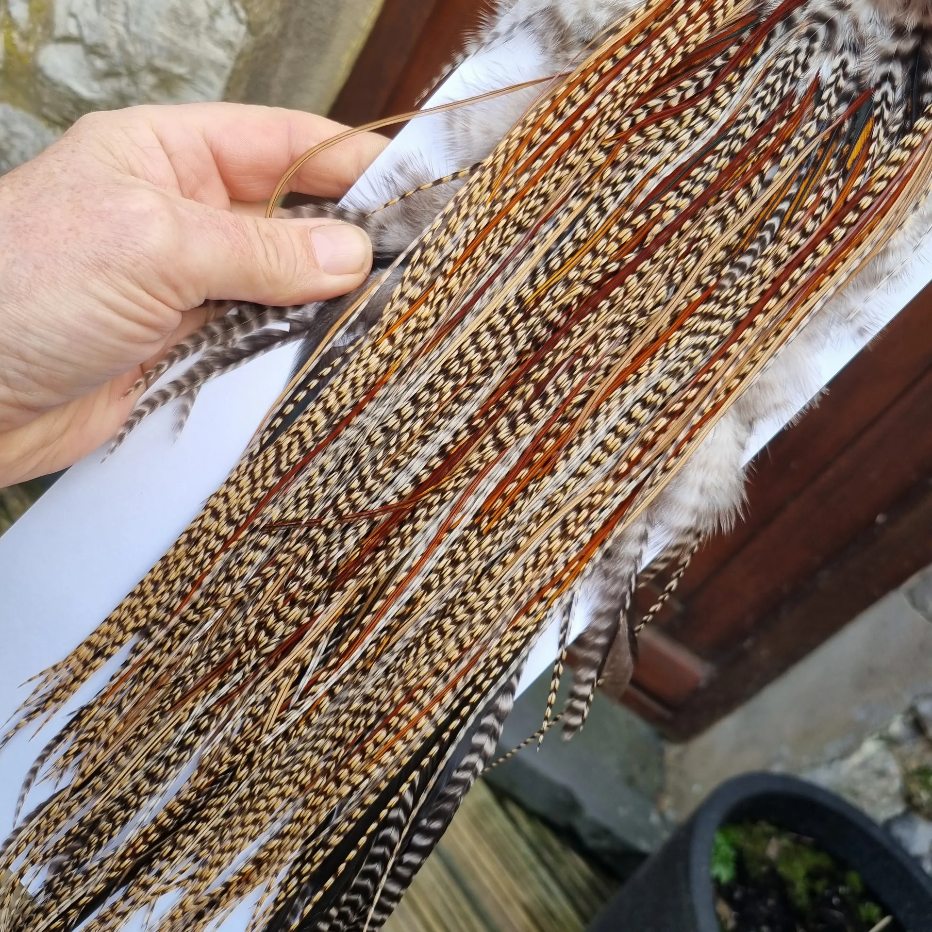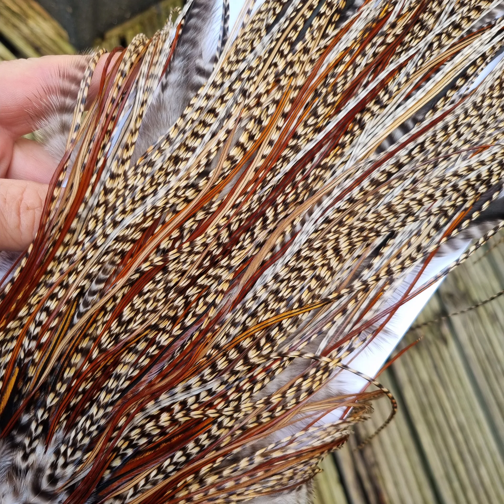 Whiting Pro-Grade Midge Dry Fly Rooster Saddle in Light CREE B Splashed with Furnace Approx. Tying Sizes are 14/16 This is the one of the hard to find Lighter Crees that arrive every now and then, it's a TRUE CREE but all 3 bars are a couple of shades lighter than would be normal for a classic cree. The range of sizes are very popular for fishing flies without going to small. Lighty Cree colour for 95% of the Saddle and 5% Furnace, densely hackled with hackles that average 13-16” (33-41cm) approx.. Take a good look at all those images to get a true idea of the colour and quality of saddle B, just look how densely hackled B is!!!. Remember THIS IS A BUY WHAT YOU SEE PRODUCT RANGE!!!!!