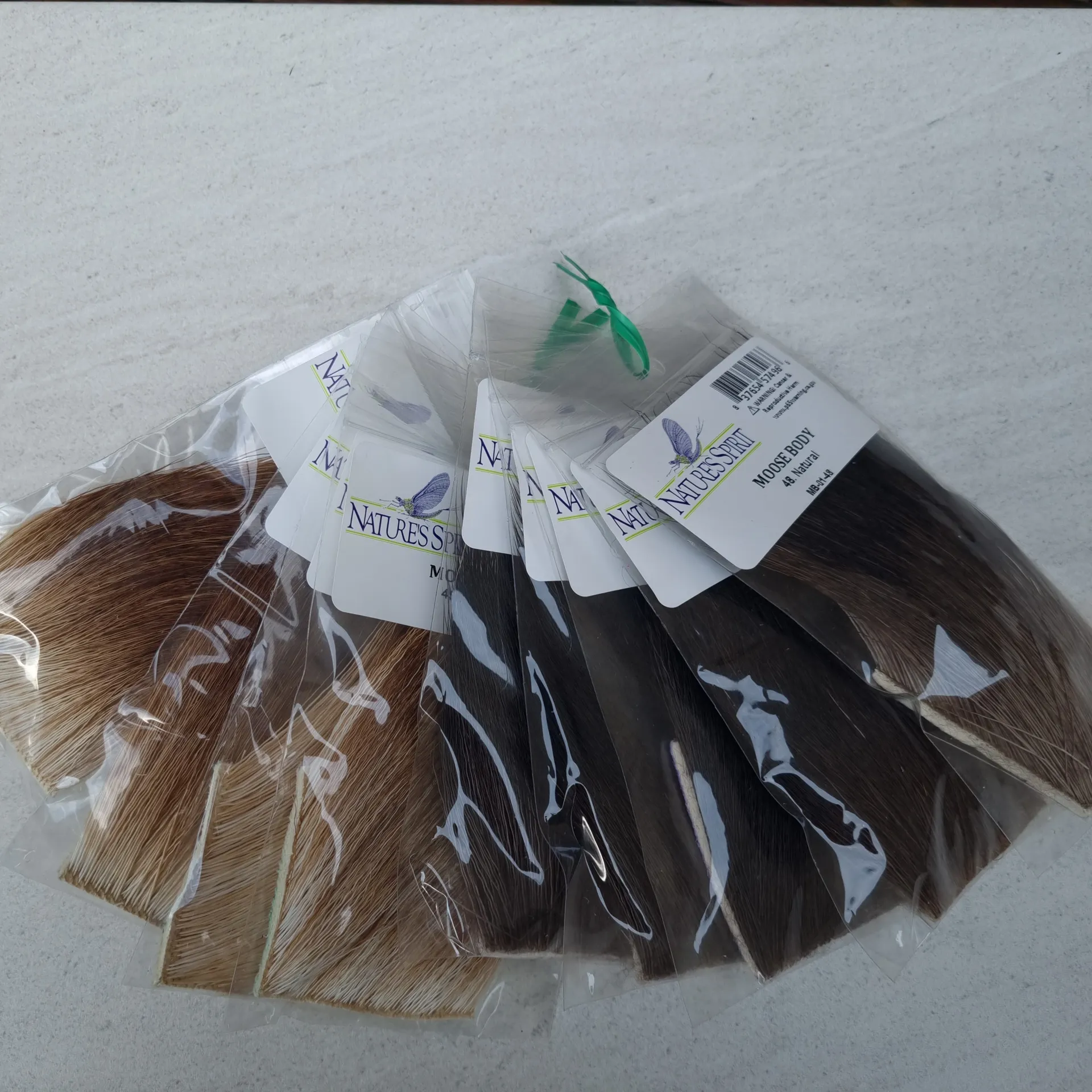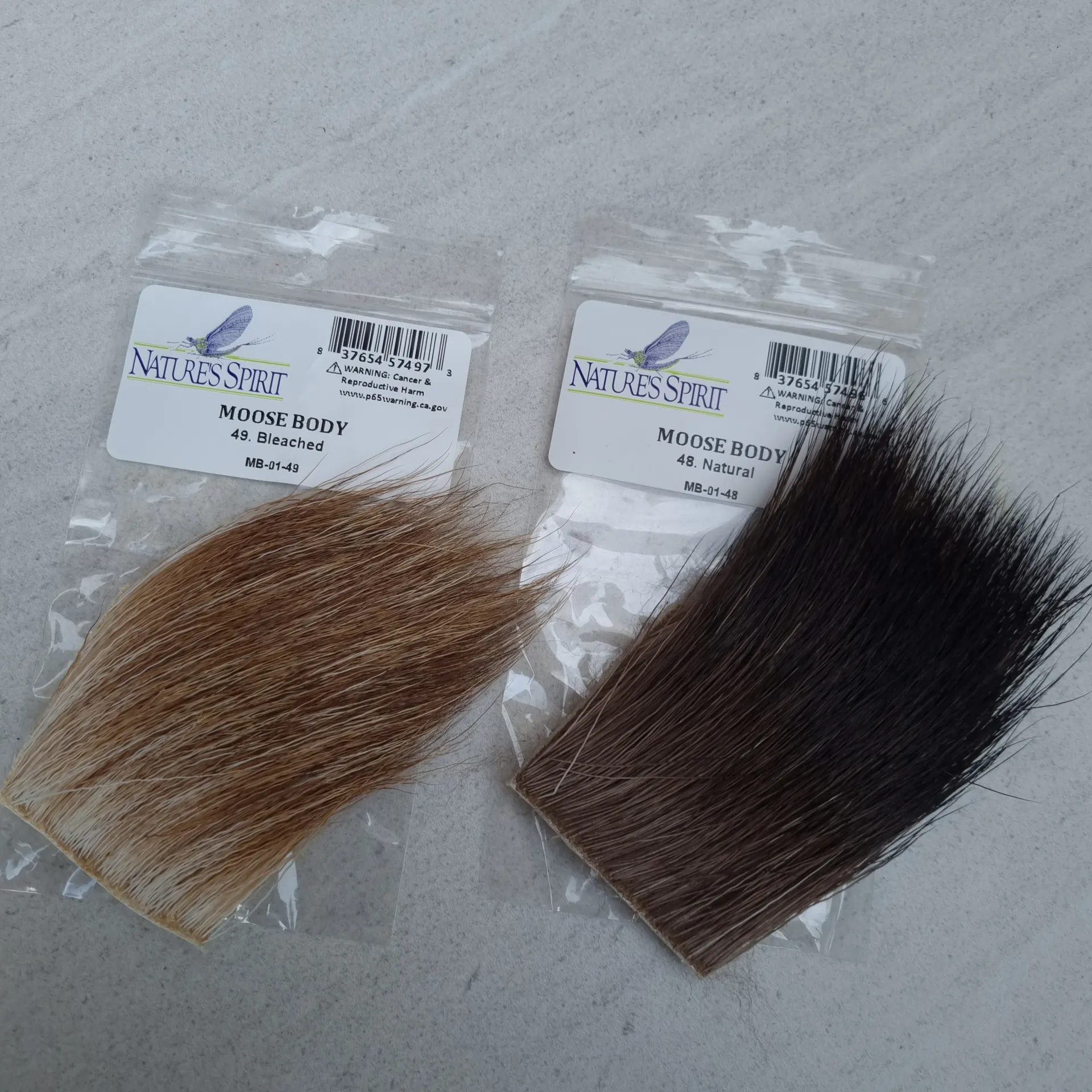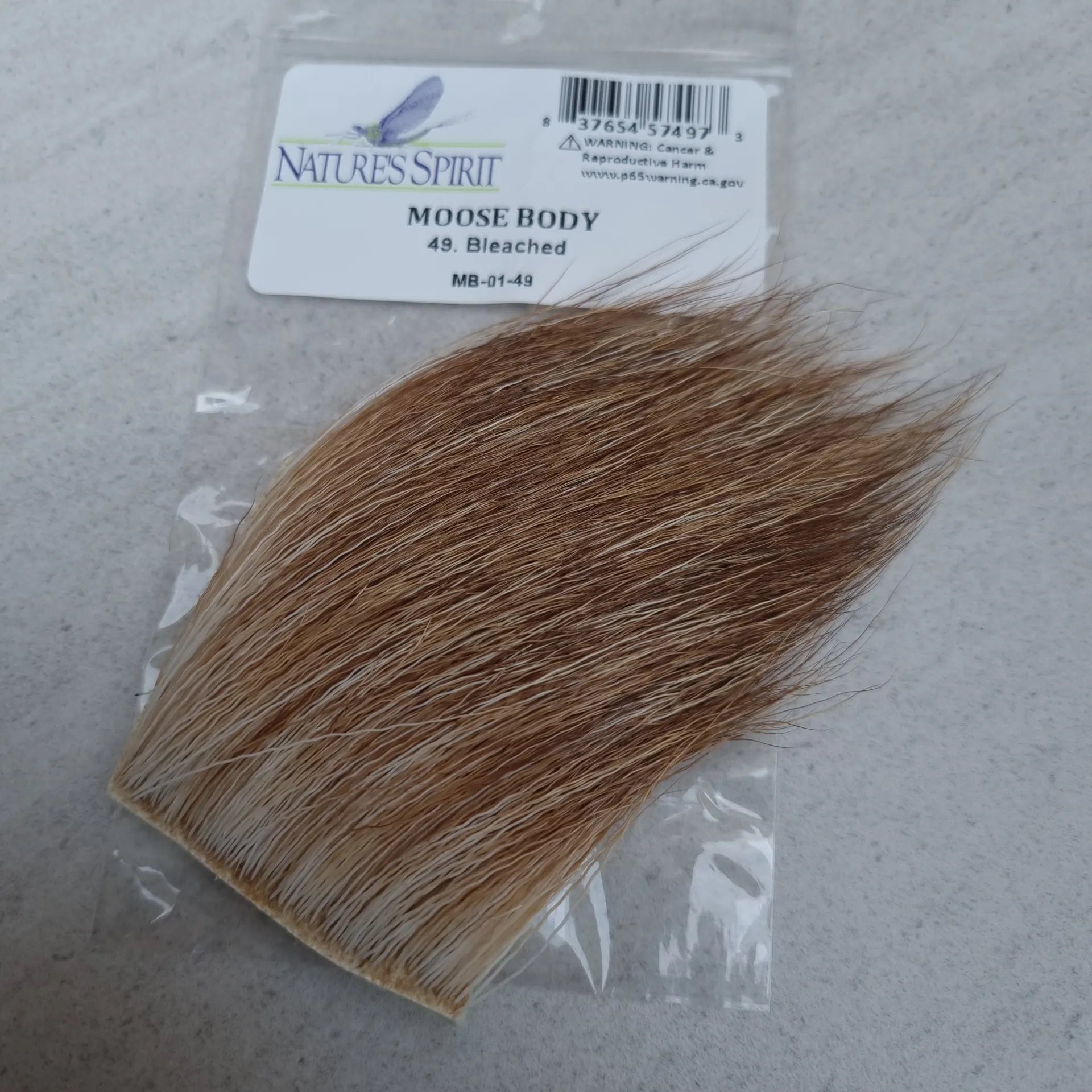 Nature's Spirit Moose Body is primarily used for tailing, but makes some nice wings as well. The natural grayish black colour bleaches to beautiful shades of ginger. Length varies from 1 1/2 " to 2" patch.