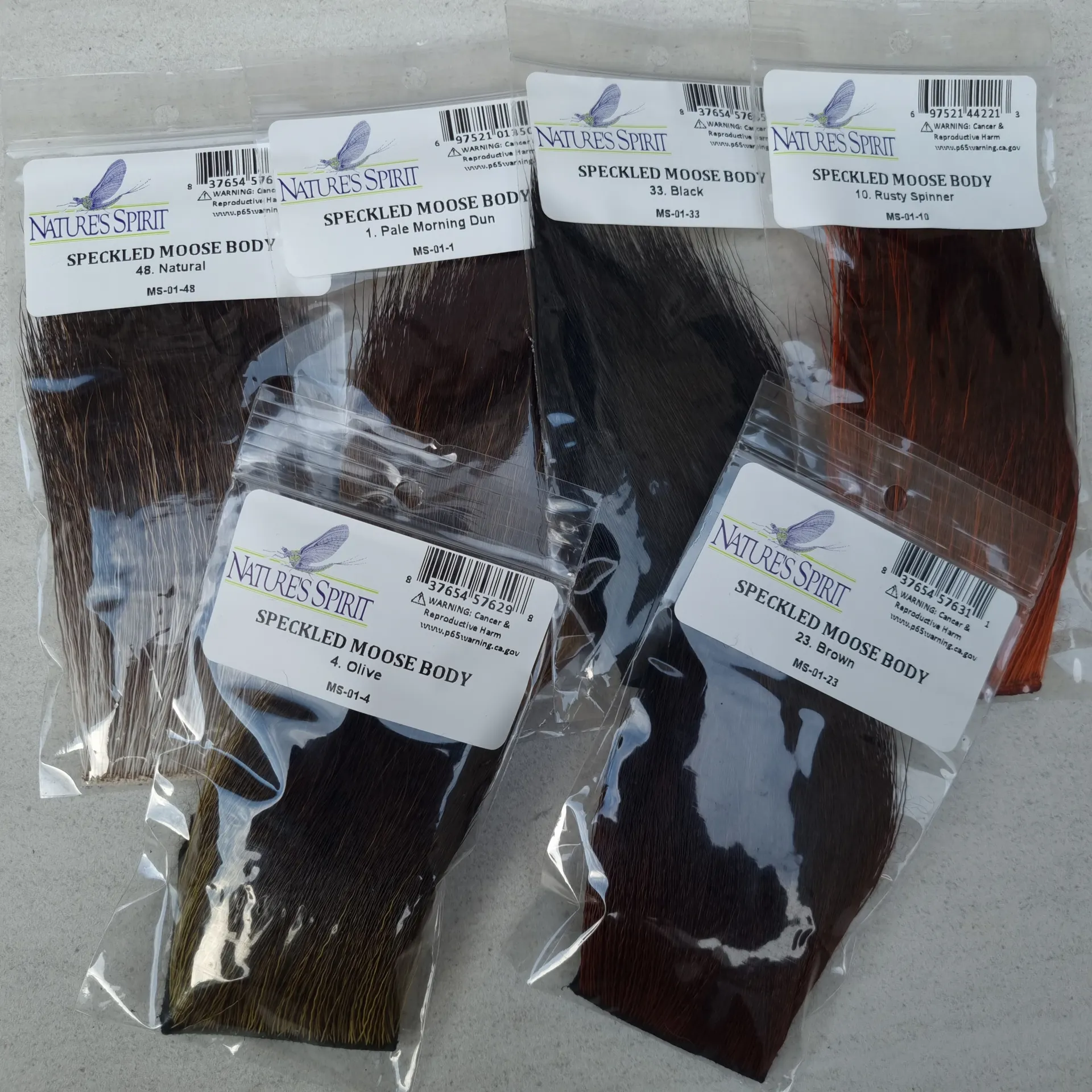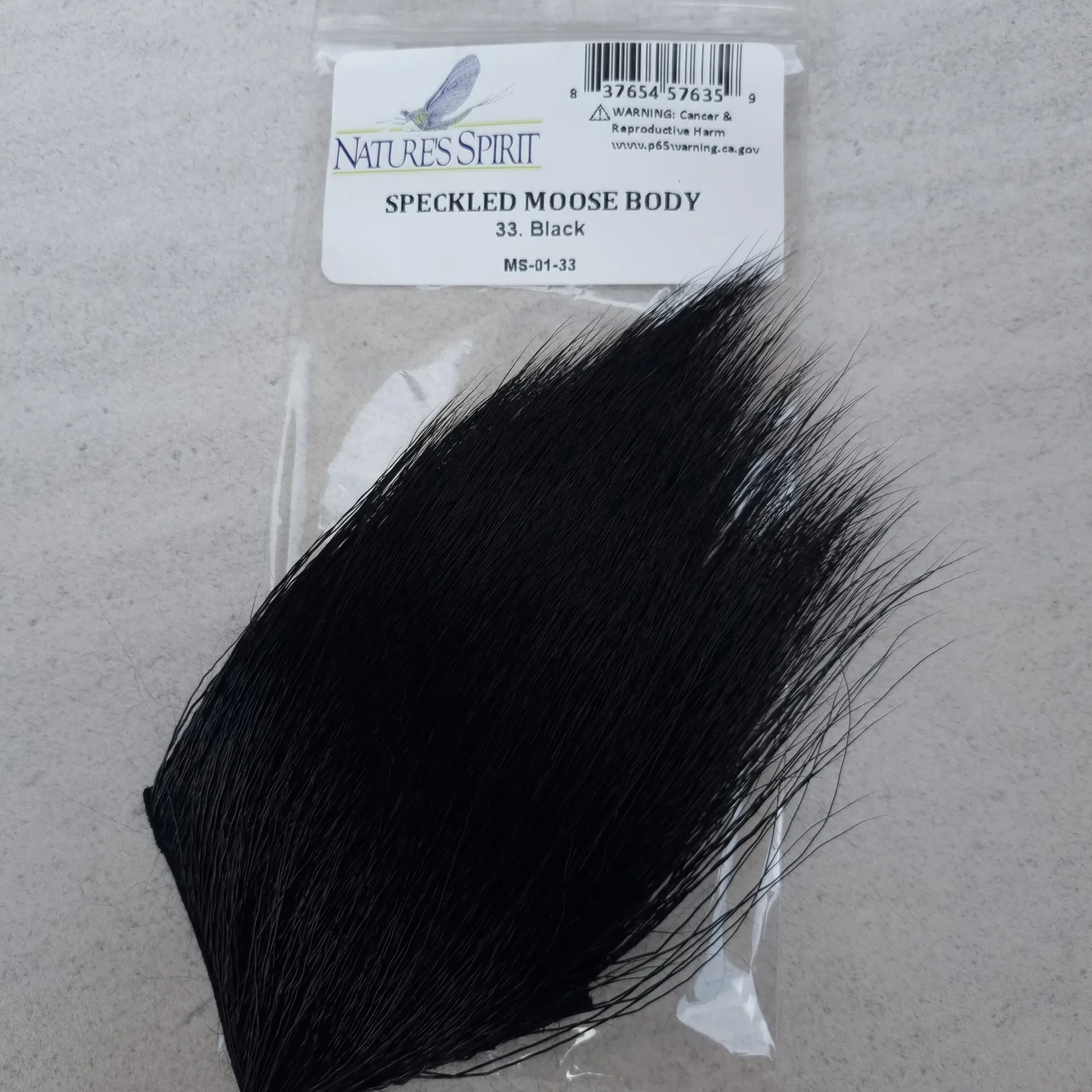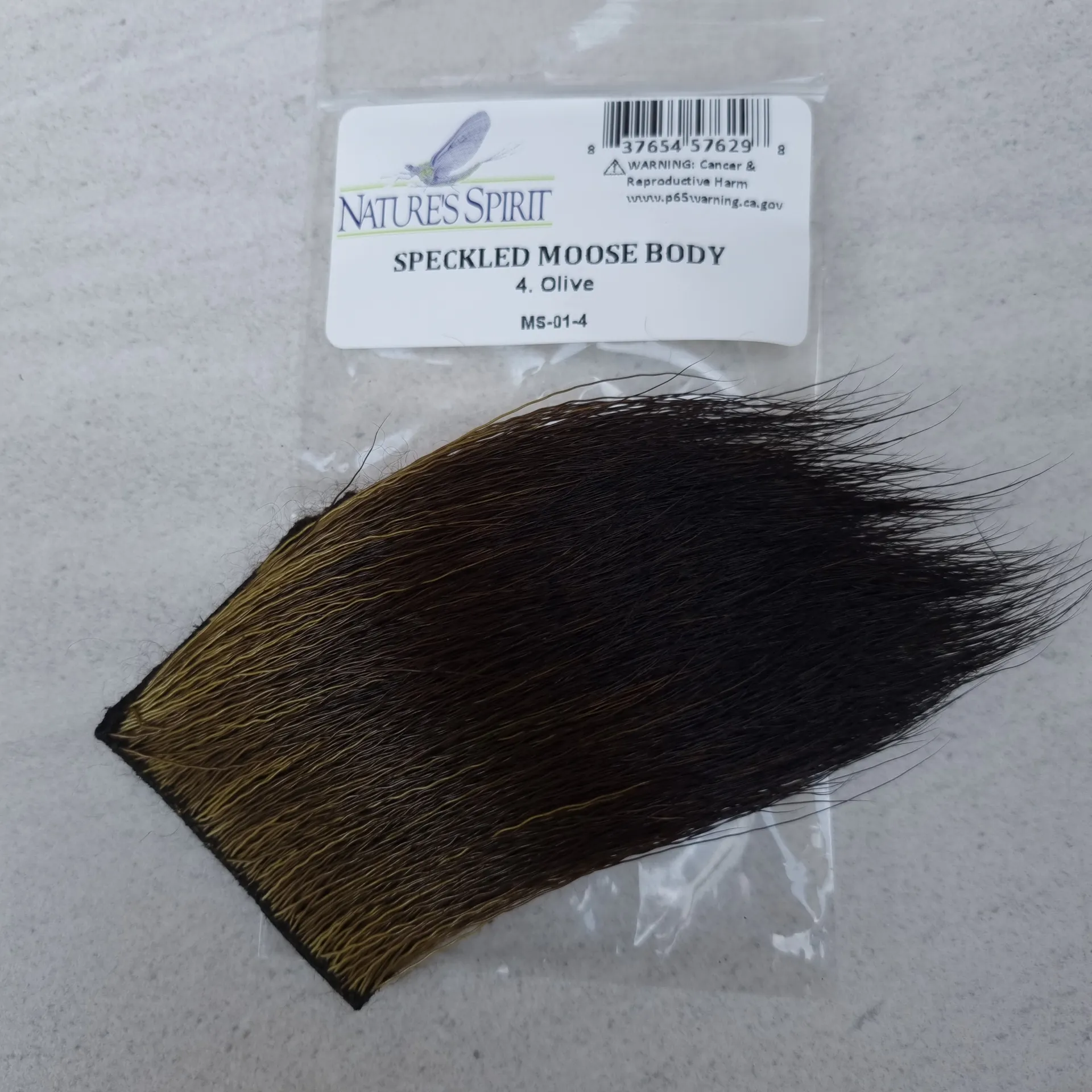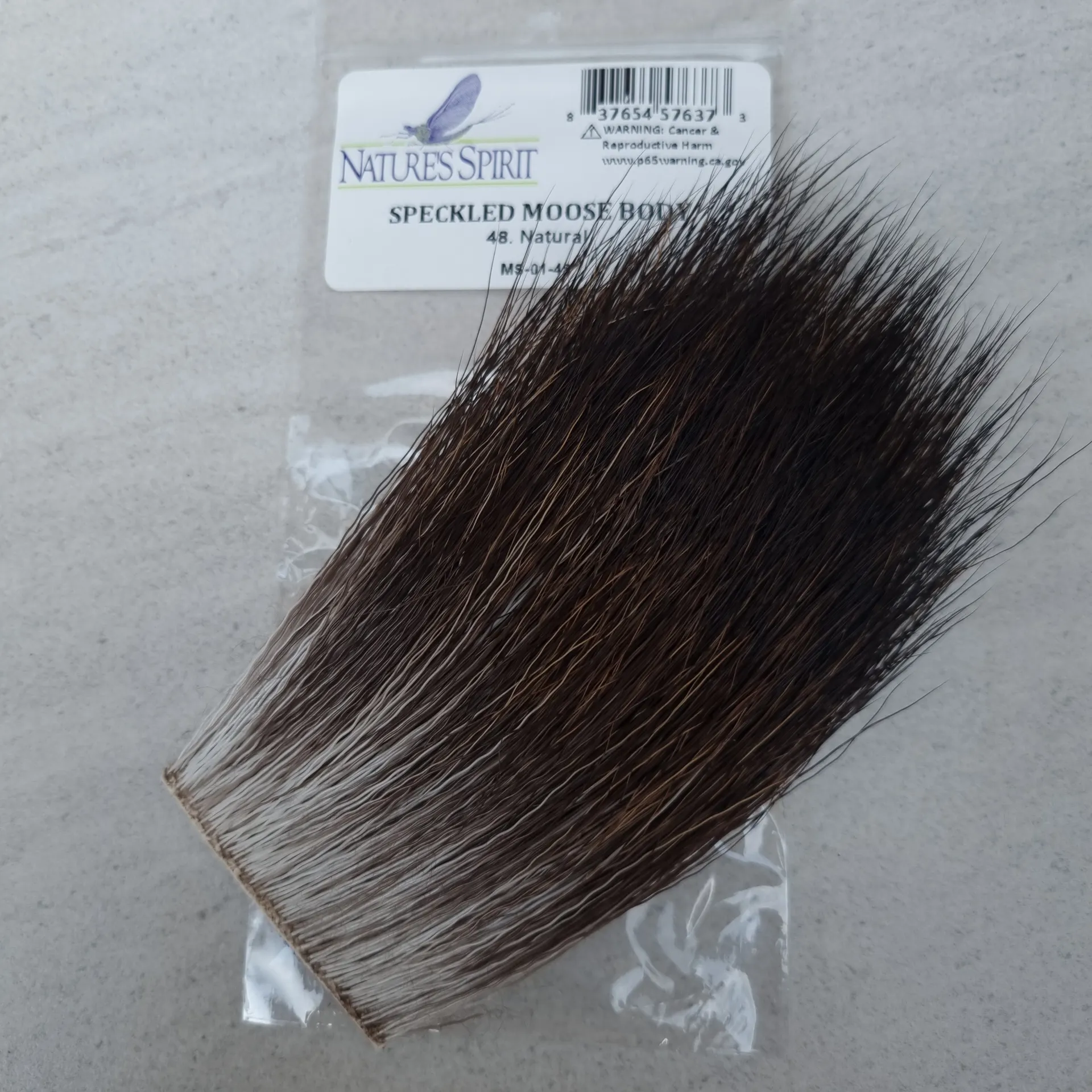 Nature's Spirit Speckled Moose Body is similar in length and texture to standard moose body hair only with a mix of white, brown, and black colors. An interesting material which can be used to wrap bodies as well as for tails and wings. 1"*2" patch